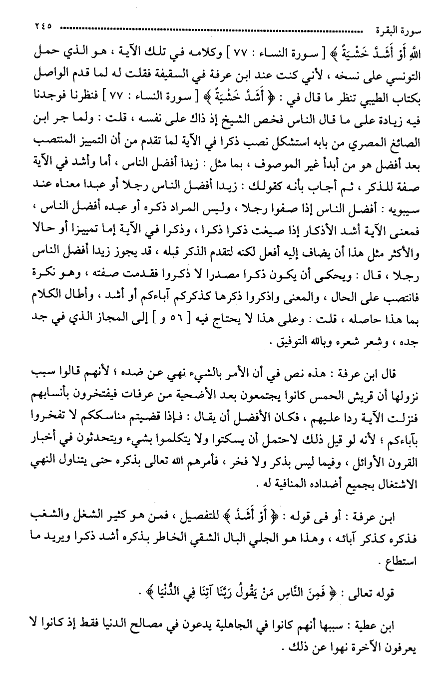 الله أَوْ أَشَدَّ خَشْيَةً} وكلامه في تلك الآية هو الذي حمل التونسيين على نسخه لأني كنت عند ابن عبد السلام في السقيقة لما قدم الواصل بكتاب الطيبي فقلت له: ننظر ما قال في «أشَدَّ خَشْيَةً» فنظرناه فوجدنا فيه زيادة على ما قال الناس فحض الشيخ إذاك على نسخه.