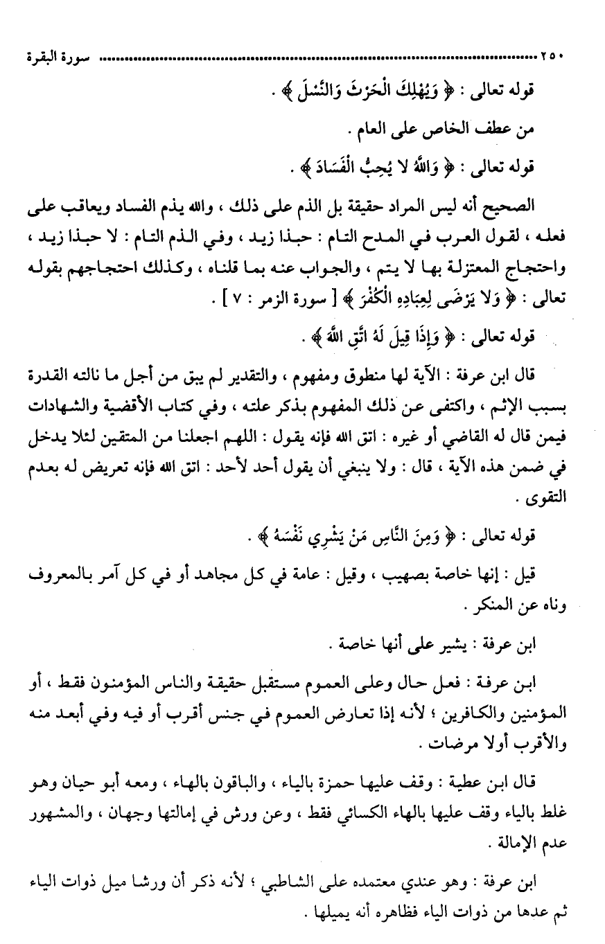 قال ابن عرفة: (يشري) على أنها خاصة (فعل حال وعلى العموم) مستقبل حقيقة و «النّاس» إمّا المؤمنون فقط أو المؤمنون والكافرون لأنه إذا تعارض العموم في جنس أقرب أو فيه وفي أبعد منه فالأقرب (أولى).