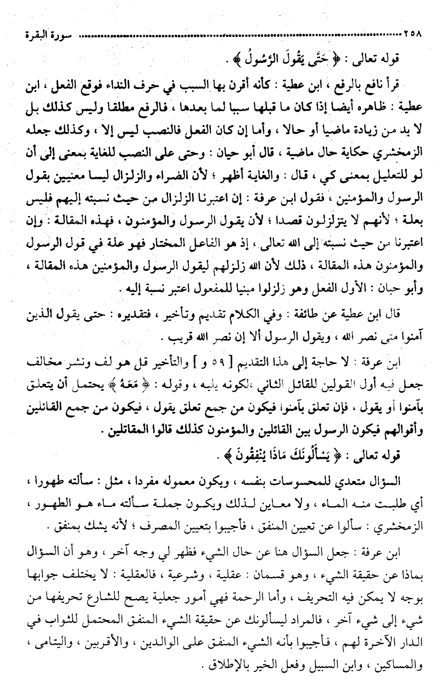 قال ابن عرفة: إن اعتبرنا (الزلزال) من حيث نسبته إليهم فليس بعلة، لأنهم لا يتزلزلون قصدا لأن يقول الرّسول والمؤمنون هذه المقالة، وإن اعتبرناه من حيث نسبته إلى الحق سبحانه وتعالى إذ هو الفاعل المختار في الحقيقة فهو علة في قول الرسول والمؤمنين؛ ذلك لأن الله تعالى زلزلهم ليقول الرسول والمؤمنون هذه المقالة. وأبو حيان لما رأى الفعل وهو «زُلْزلُوا» مبنيا للمفعول اعتبر نسبته إليه.