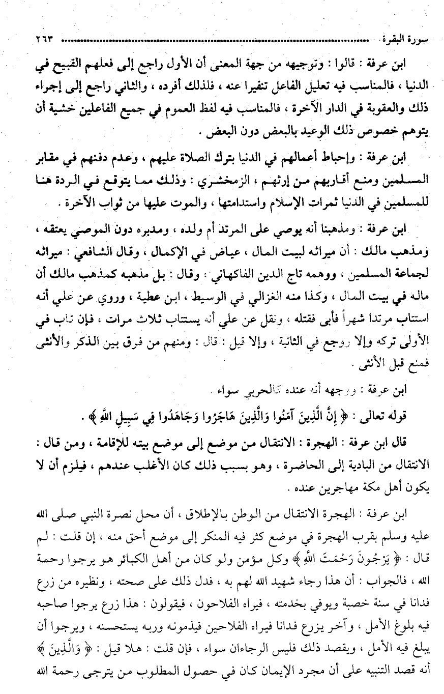 قال ابن عرفة: الهجرة الانتقال من الوطن إلى محل نصرة النّبي صَلَّى اللَّهُ عَلَيْهِ وَسَلَّم َ ويقرب منه الهجرة في موضع كثير المنكر إلى موضع (أخف) منه.