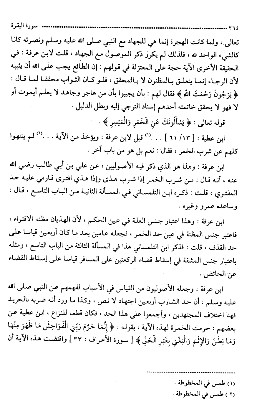 قال ابن عرفة: قال ابن عطية، والشيخ الزمخشري: لما نزلت (هاته الآية) شربها قوم وتركها آخرون. قام بعض الشاربين فقرأ: قُلْ يا أَيُّهَا الْكَافِرُونَ أَعْبُدُ مَا تَعْبُدُونَ أسقط (لا) فنزلت: {لاَ تَقْرَبُواْ الصلاة وَأَنْتُمْ سكارى} قال ابن عرفة: هذا نصّ على أنّ لفظ التأثيم في قوله عَزَّ وَجَلَّ ّ: «قُل فِيهمَا إِثْمٌ كَبِيرٌ» غير ملزوم للتحريم لأنّ الصحابة رَضِيَ اللَّهُ عَنْهم لم ينتهوا عنها بهذه الآية فيستفاد منه الجواب عن السؤال المورود على قول الفقهاء: إنّ اتّخاذ السترة للمصلي سنة، مع قولهم: إن تركها وصلى حيث لا يأمن المرور فمر عليه أحد أثِمَ. (قال: وكنّا أجبنا عنه بأنه إنما أثم بالتعرّض للمرور والمرور معا) لأنه لو لم يمر عليه أحد لما أثم.