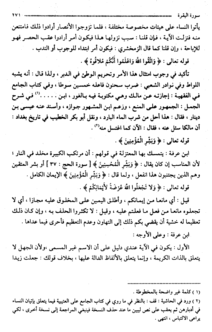قال ابن عرفة: قد يتمسك بها المعتزلة في قولهم: إن مرتكب الكبيرة مخلد في النار لأن المناسب أن كان يقال وبشر المحسنين (أو بشّر المتّقين) الذين يجتنبون هذا الفعل، فما قال «وَبَشِّرَ / المُؤْمِنِينَ» دل على أن فاعل هذا الفعل غير مؤمن؟