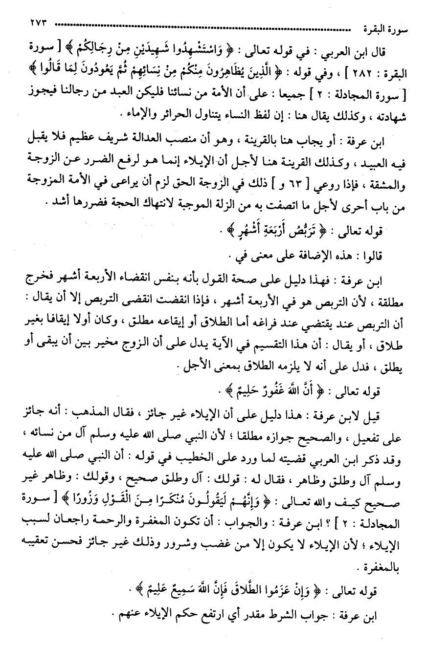 قال ابن عرفة: فهذا دليل على صحة القول بأنه بنفس انقضاء الأربعة أشهر تخرج مطلقة لأن التربّص هو في الأربعة أشهر فإذا انقضت انقضى التربص إلاّ أن يقال: إن التربّص (يقتضي) عند فراغه إما الطلاق أو (أيقافه) ليطلق، وكان أوّلا اتفاقا بغير طلاق. أو يقال: إنّ هذا التقسيم في الآية يدل على أنّ الزوج مخير بين أن يبقي أو يطلق، فدل على أنّه لا يلزمه الطلاق بمضي الأجل.