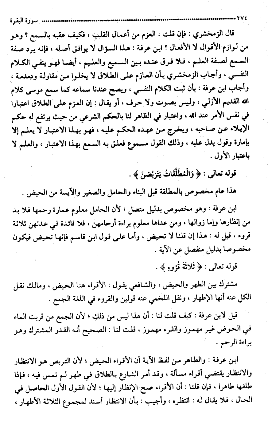 قال ابن عرفة والظّاهر في لفظ الآية أن الأقراء الحيض، لأن التربص هو الانتظار، والانتظار يقتضي (أقراء مستقبلة)، وقد أمر الشارع بالطلاق في طهر لم تمس فيه، فاذا طلقها طاهرا، فان قلنا: إن الأقراء: الحيض، صح الانتظار، وان قلنا: الاطهار، لم يستقم إسناد الانتظار إليها لأن (القرء) الأول حاصل في الحال. فلا (يقال) له: انتظره. وأجيب: بأنّ الانتظار أسند ((لمجموع الثلاثة أطهار.