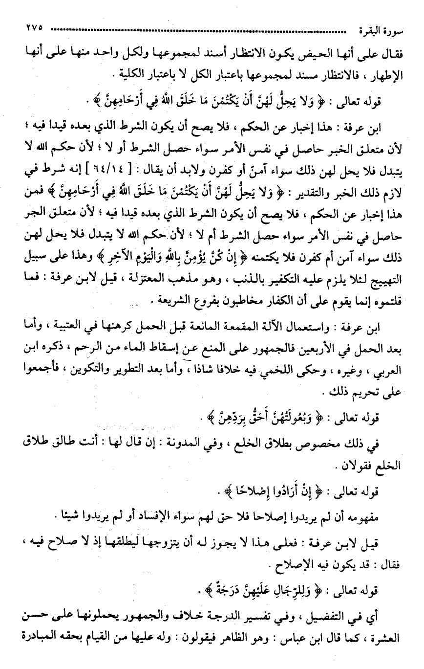 قال ابن عرفة: هذا إخبار عن الحكم، فلا يصح أن يكون الشرط الذي بعده قيدا فيه لأن متعلق الخبر حاصل في نفس الأمر سواء حصل الشرط أو لا. لأن حكم الله لا يتبدل فلا يحل لهن ذلك سواء آمنّ أو كفرن، ولا بدّ أن يقال: إنه شرط في لازم ذلك الخبر. والتقدير لا يحل لهن أن يكتمن ما خلق الله في أرحامهن فلا يكتُمنه إن كن يؤمن بالله، وهذا على سبيل التهييج لئلا يلزم عليه التكفير بالذنب وهو مذهب المعتزلة.