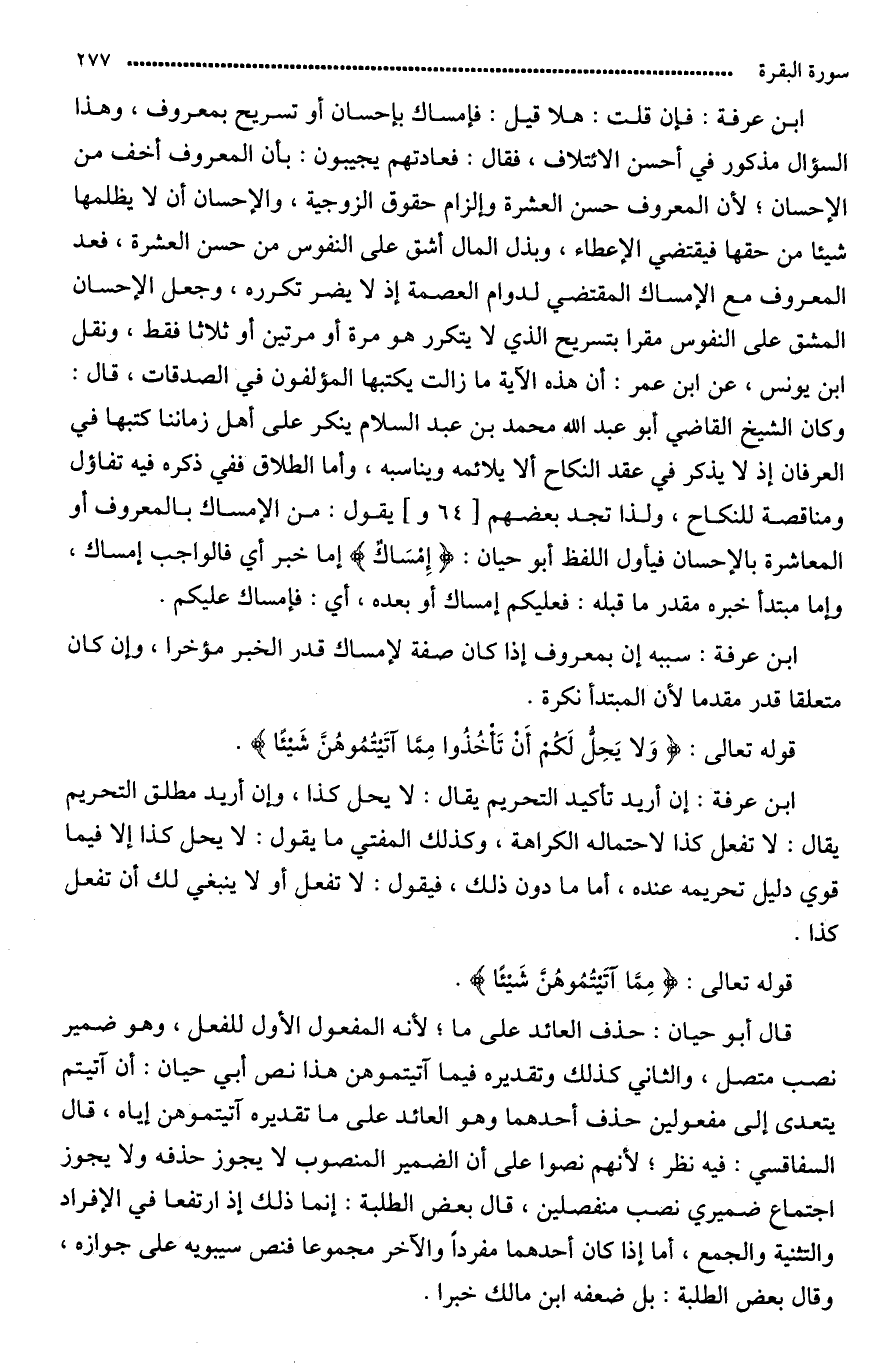 قال ابن عرفة: فإن قلت: هلا قيل: فإمساك بإحسان أو تسريح بمعروف، وهذا السؤال مذكور في حسن الائتلاف؟