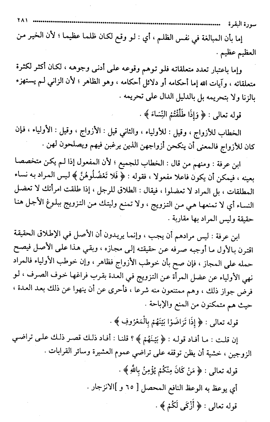 وقوله: {فَلاَ تَعْضُلُوهُنَّ} ليس المراد به (نساءكم) المطلقات بل المراد لا تعضلوا النّساء بالإطلاق فيقال للرّجال: إذا طلقت امرأتك لا تعضل النّساء، أي لا تمنعها هي من التزويج ولا تمنع وليّتك من التّزويج. قالوا: وبلوغ الأجل هنا حقيقة وليس المراد مقاربته.