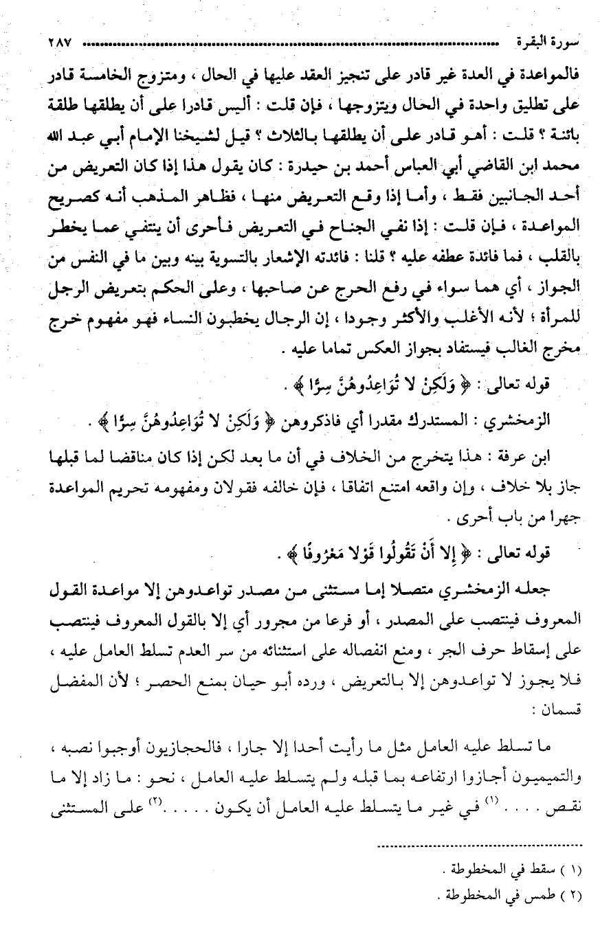جلعها الزمخشري متصلا أمّا مستثنى من مصدر «تُوَاعِدُوهُنَّ» أي إلاّ مواعدة القول المعروف فينتصب على المصدر أو مفرعا من مجرور أي إلاّ بالقول المعروف فينتصب على إسقاط حرف الجر، ومنع انفصاله على استثنائه من «سِرّا» لعدم تسلّط العامل عليه فلا يجوز: لاَ تُوَعِدُوهُنّ إِلاّ التعريض.