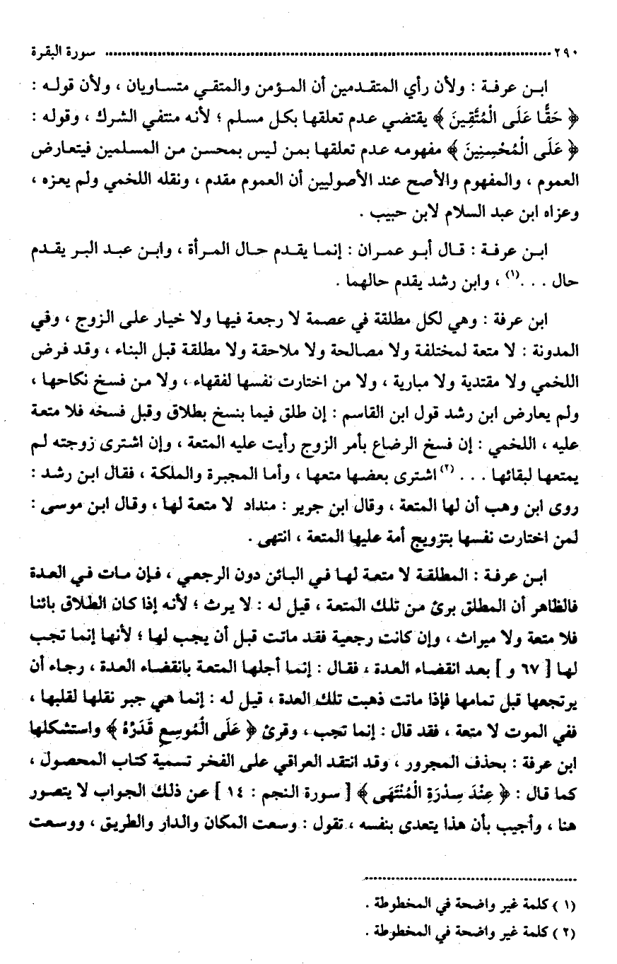 قال ابن عرفة: ولأن رأي المتقدمين أن المؤمن والمتقي متساويان ولأن قوله: {حَقّاً عَلَى المتقين} يقتضي عموم تعلقها بكل مسلم لأنه متق الشرك وقوله «عَلَى الْمُحْسِنِينَ» مفهومه عدم تعقلها بمن ليس بمحسن من المسلمين فيتعارض العموم والمفهوم والأصح عند الأصوليين أن العموم مقدم ونقله اللَّخمي ولم يعزه وعزاه الامام ابن عبد السلام لابن حبيب.