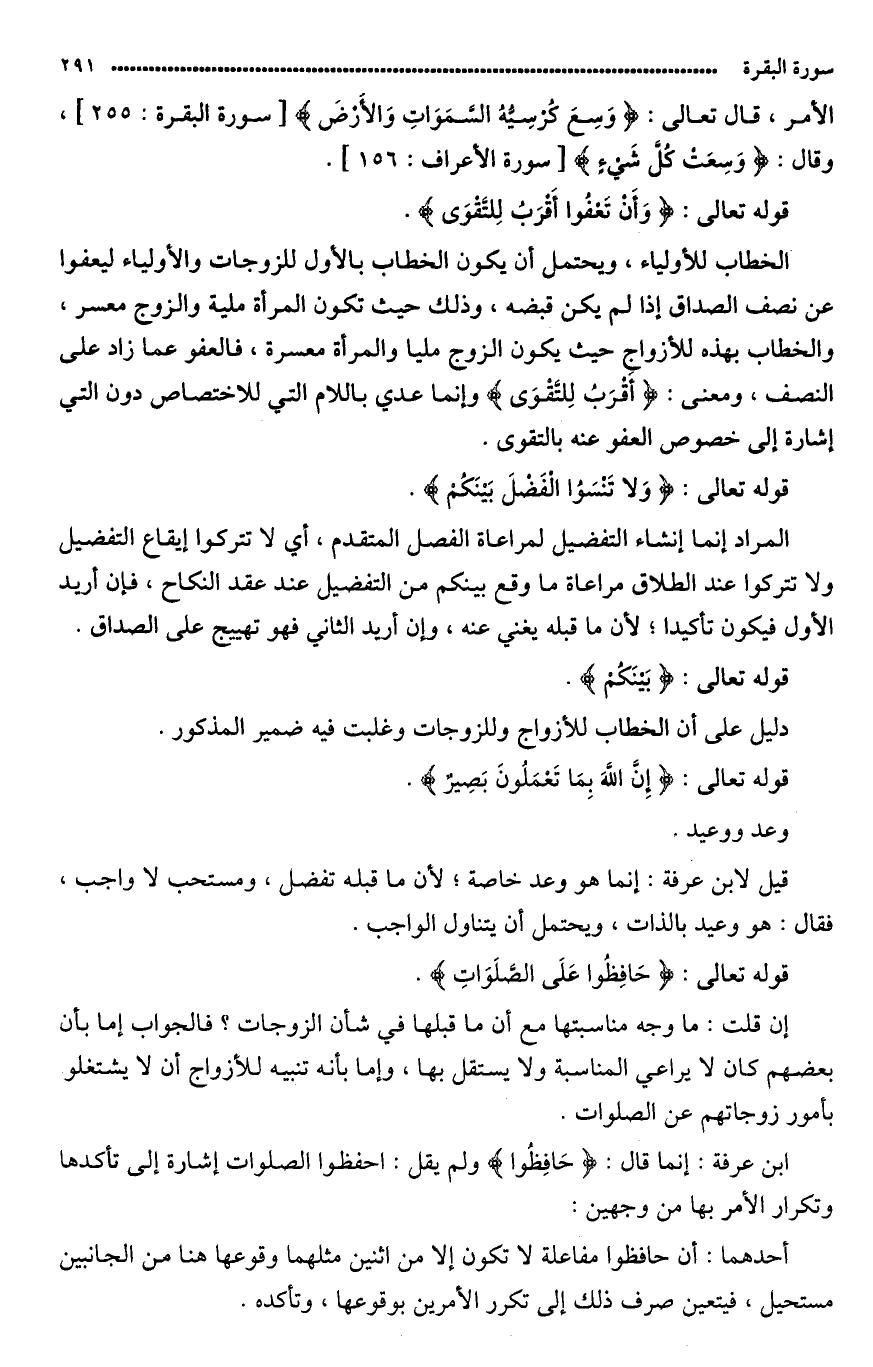 الخطاب للأولياء، ويحتمل أن يكون الخطاب بالأول للزوجات والأولياء ليعفوا عن نصف الصداق إذا لم (يمكن) قبضه، وذلك حيث تكون ملية والزوج معسر. والخطاب (بهذه) للأزواج حيث يكون الزوج مليا والمرأة معسرة فالعفو عما زاد على النصف. ومعنى «أَقْرَبُ للتقوى» أن الصداق أمر دنيوي وقد ورد «حبّ الدّنيا رأس كل خطيئة» فتركه أقرب للتقوى)، وإنما عدي باللام التي للاختصاص دون (إلى) إشارة إلى خصوص العفو عنه بالتقوى.