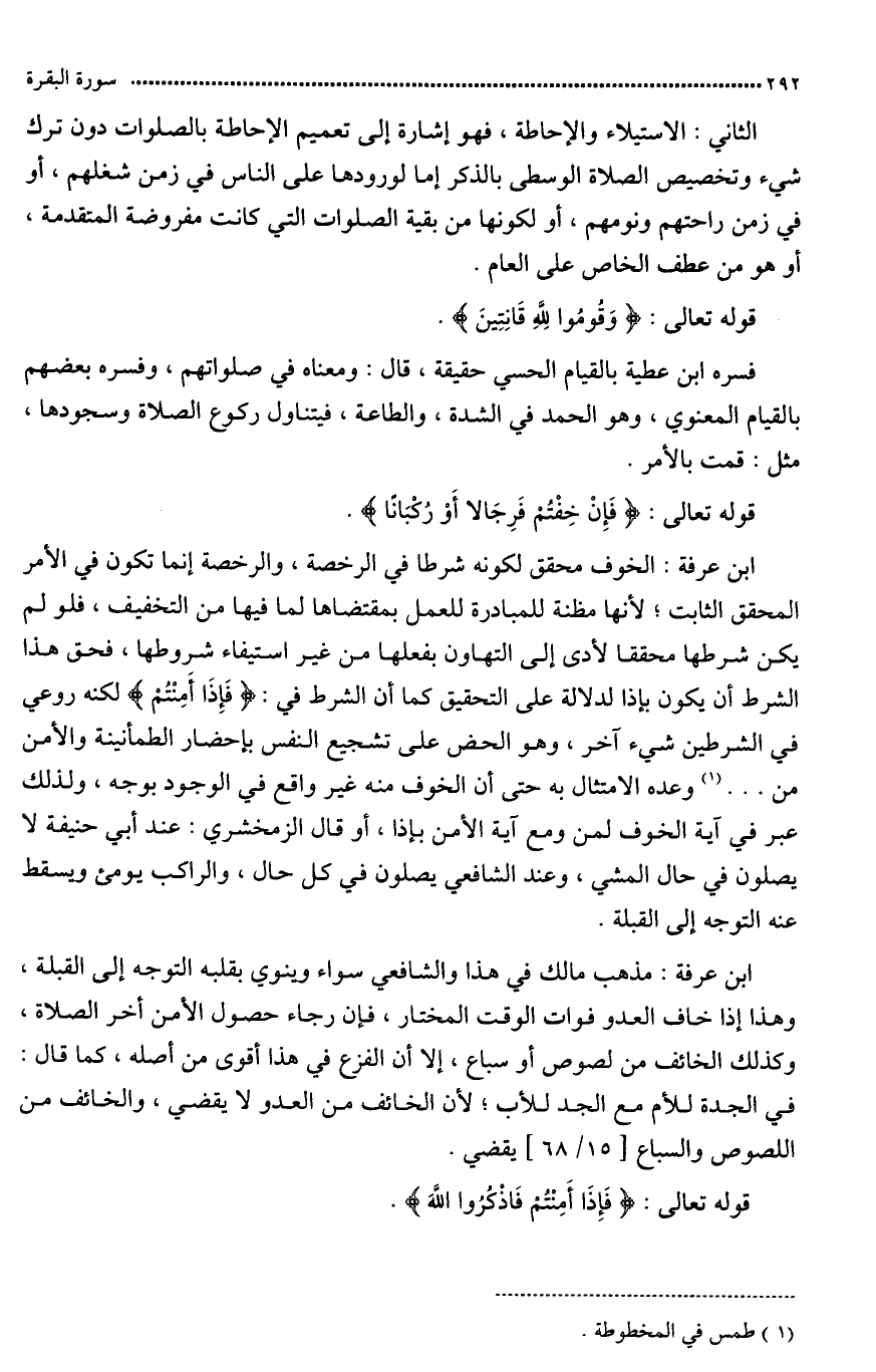 قال ابن عرفة: الخوف أمر محقق لكونه شرطا في الرخصة والرخصة إنما تكون في الأمر المحقق الثابت لأنها مظنة المبادرة للعمل بمقتضاها لما فيها من التخفيف، فلو لم يكن شرطها محققا لأدّى إلى التهاون بفعلها