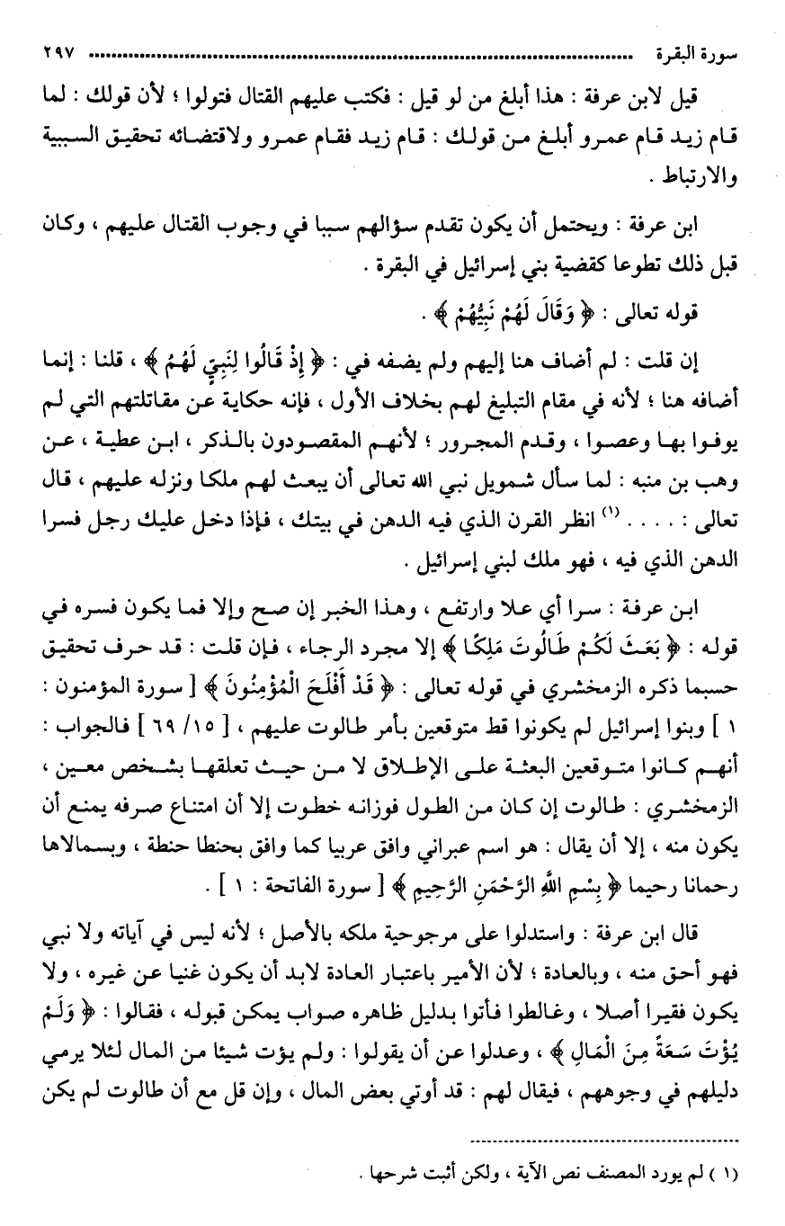 قال ابن عرفة سرا أي ارتفع. وهذا الخبر إن صح وإلاّ فما يكون (مفسره) (في قوله {بَعَثَ لَكُمْ طَالُوتَ مَلِكاً}) إلا مجرد (الوحي).