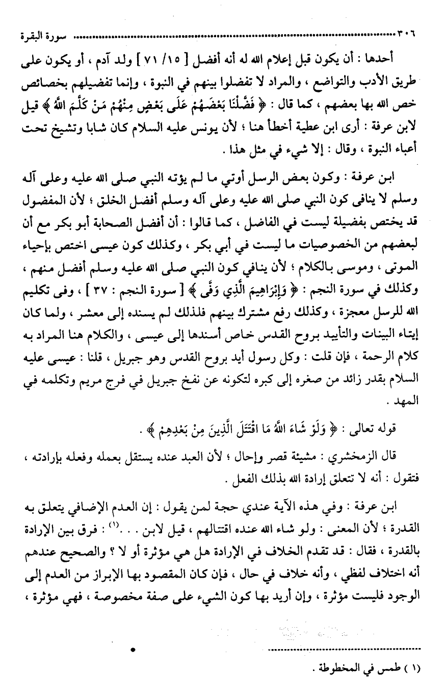 قال ابن عرفة: وكون بعض الرسل أوتي ما لم يؤته النبي صَلَّى اللَّهُ عَلَيْهِ وَسَلَّم َ (لا ينافي كون النبي صَلَّى اللَّهُ عَلَيْهِ وَسَلَّم َ) أفضل الخلق لأن المفضول قد يختص بفضيلة هي ليست في الفاضل كما قالوا: إن (أفضل) الصحابة أبو بكر مع أن لبعضهم من الخصوصيات ما ليست في أبي بكر، وكذلك كون عيسى (اختص) بإحياء الموتى وموسى بالكلام لا ينافي كون النبي صَلَّى اللَّهُ عَلَيْهِ وَسَلَّم َ أفضل منهم، وكذلك قوله في سورة النجم {وَإِبْرَاهِيمَ الذي وفى} وتكليم الله للرسل ليس بمعجزة، وكذلك رفع الدرجات مشترك بينهم، فلذلك لم يسنده إلى معين (ولما كان إيتاء البينات والتأييد خاصا بروح القدس أسنده إلى عيسى.