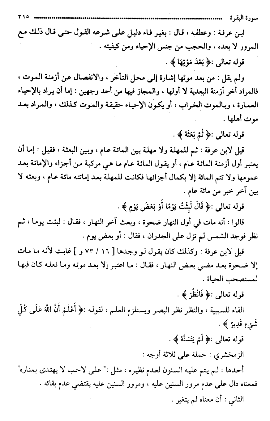 فقال: إما أن يعتبر أول أزمنة المائة عام أو نقول: المائة عام ماهية مركبة من أجزاء والإماتة بعد مجموعها، ولا تسمى الماهية إلا بكمال أجزائها فكانت المهلة بين إماتته مائة عام وبعثه لابين آخر جزء مائة).
