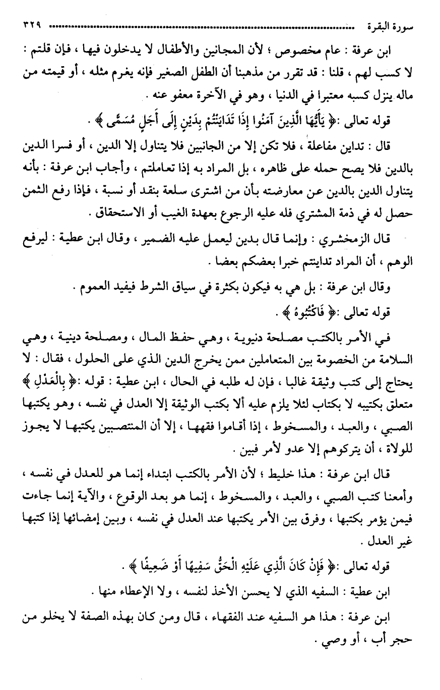 قال ابن عرفة: هذا تخليط لأن الأمر بالكتب ابتداء إنّما هو للعدل في نفسه وإمضاء كتب الصبّي والعبد والمسخوط إنّما هو بعد الوقوع، والآية إنّما جاءت فيمن يؤمر بكتبها وفرّق بين الأمر في كتبها عند العدل في نفسه وبين إمضائها إذا كتبها غير العدل.