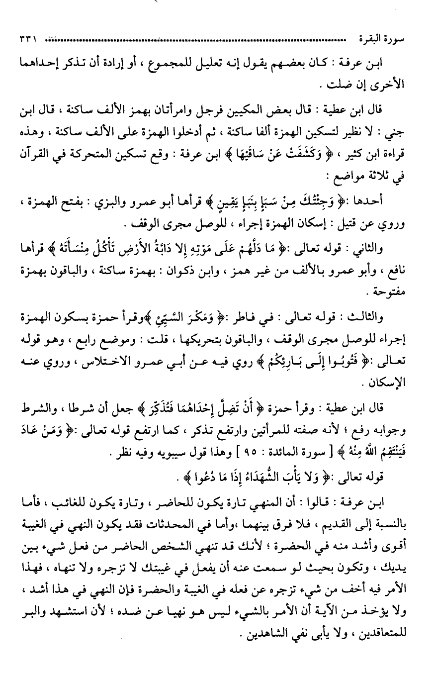 قال بن عرفة: قالوا: إن النهي تارة يكون للحاضر، وتارة يكون للغائب، فأمّا بالنسبة إلى القديم فلا فرق بينهما، وأما في المحدثات فقد يكون النهي في الغيبة أقوى وأشد منه في الحضرة، لأنك قد تنهي الشخص الحاضر عن فعل شيء بين يديك وتكون بحيث لو سمعت عنه أنه يفعله في غيبتك لا تزجره ولا تنهاه. فهذا الأمر فيه أخف من شيء تزجره على فعله في الغيبة والحضرة فإن النهي في هذا أشد. ولا يؤخذ من الآية أنّ الأمر بالشيء ليس هو نهيا عن ضده لأن «اسْتَشْهِدُوا» أمرٌ للمتعاقدين «وَلاَ يَأْبَ» نهي للشاهدين.