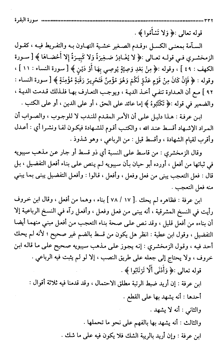 ابن عرفة: هذا دليل على أنّ الأمر المقدم الندب لا للوجوب. والصواب أنّ المراد الإشهاد أقسط عند الله (والكتاب) أقوم للشهادة فيكون لفّا ونشرا، أي أعدل وأقرب لقيام الشهادة.