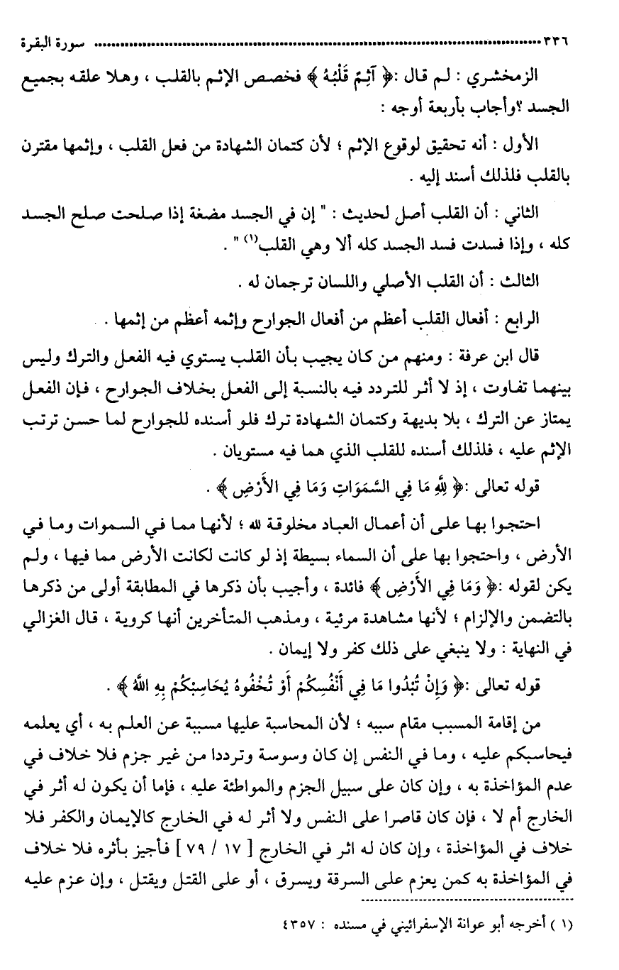 قال ابن عرفة: ومنهم من كان يجيب بأن القلب يستوي فيه الفعل والترك وليس بينهما تفاوت إذ لا أثر (للترك) فيه بالنّسبة إلى الفعل بخلاف الجوارح فإنّ الفعل يمتاز عن التّرك (بالبديهة) وكتمان الشهادة ترك فلو أسند للجوارح لما حسن (ترتب) الإثم عليه فلذلك أسند للقلب الذي هما فيه مستويان.