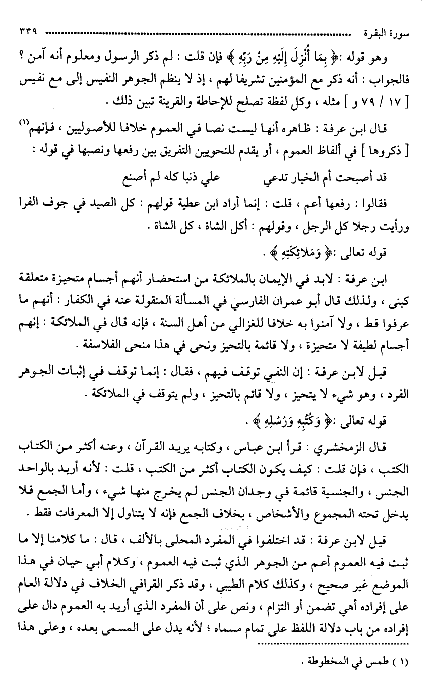 قال ابن عرفة: وظاهر أنّها ليست نصّا في العموم خلافا للأصوليين فإنهم ذكروها في ألفاظ العموم وتقدم للنحويين التفريق بين رفعها ونصبها في قوله: