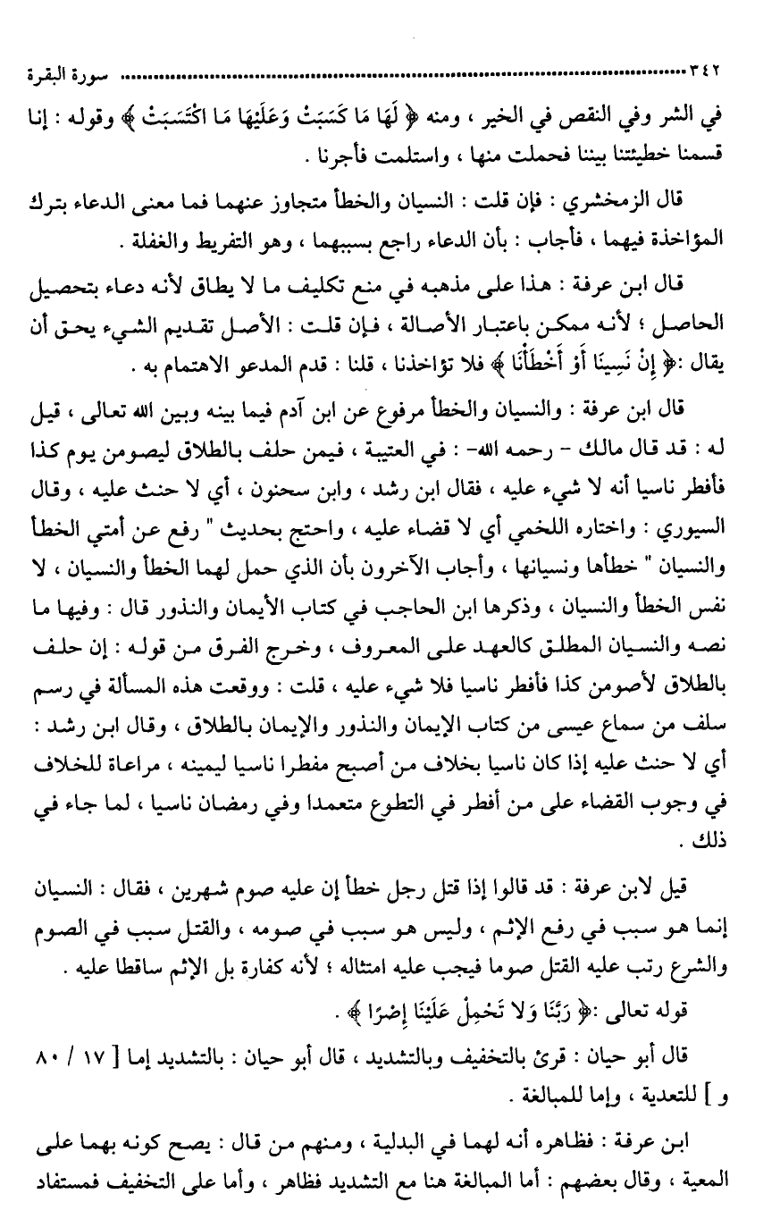 قال ابن عرفة: فالنسيان والخطأ مرفوع عن ابن آدم فيما بينه وبين الله تعالى. قيل له: قد قال الإمام مالك رَضِيَ اللَّهُ عَنْه في العتبية فيمن حلف بالطلاق: ليصومن يوم كذا فأفطر ناسيا: إنّه لا شيء عليه؟