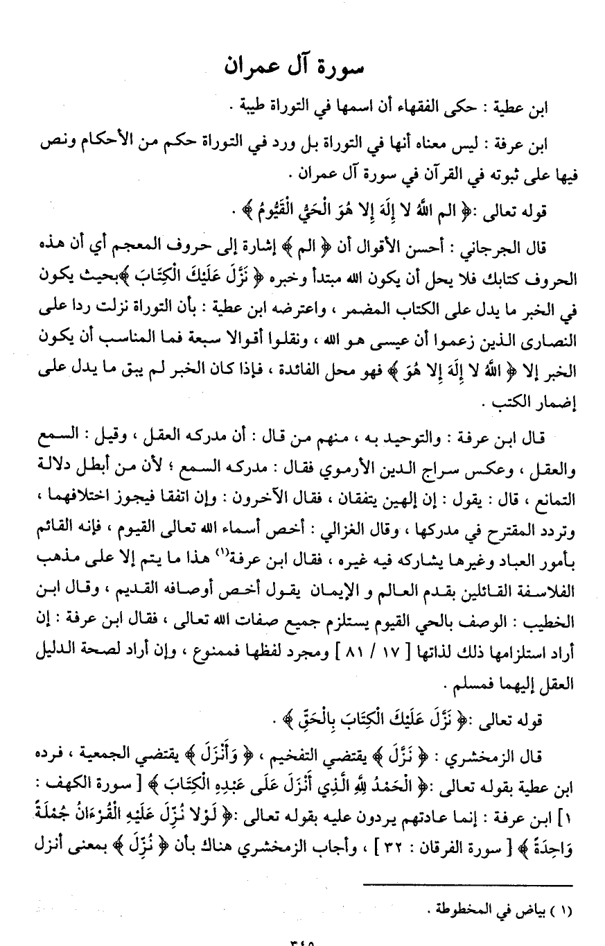 قال الجرجاني: أحسن الأقوال أن (الم) إشارة إلى حروف المعجم أي أن هذه الحروف كتابك فلا يحل أن يكون الله مبتدأ وخبره (نَزلَ عَلَيكَ الكِتَابَ) بحيث يكون في الخبر ما يدل على الكتاب المضمر، واعترضه ابن عطية: بأن التوراة نزلت ردا على النصارى الذين زعموا أن عيسى هو الله، ونقلوا أقوالا سبعة فما المناسب أن يكون الخبر إلا (اللَّهُ لَا إِلَهَ إِلَّا هُوَ) فهو محل الفائدة، فإذا كان الخبر لم يبق ما يدل على إضمار الكتب.
