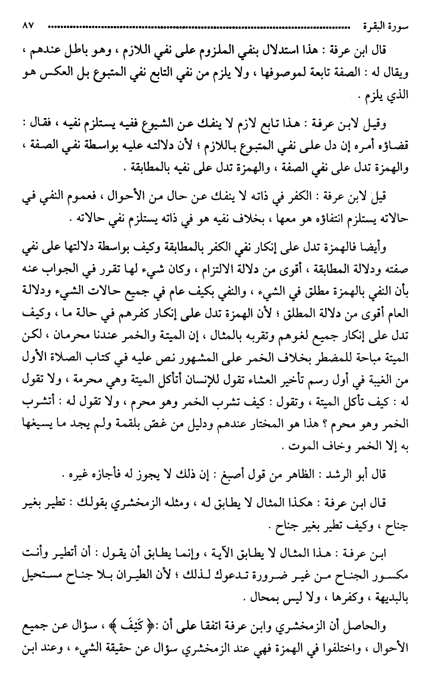 (قلت): والحاصل أن الزمخشري والشّيخ ابن عرفة اتّفقا على أنّ «كَيْفَ» سؤال عن جميع الأحوال (واختلفا) في الهمزة فهي عند الزمخشري سؤال عن حقيقة الشيء، وعند ابن عرفة