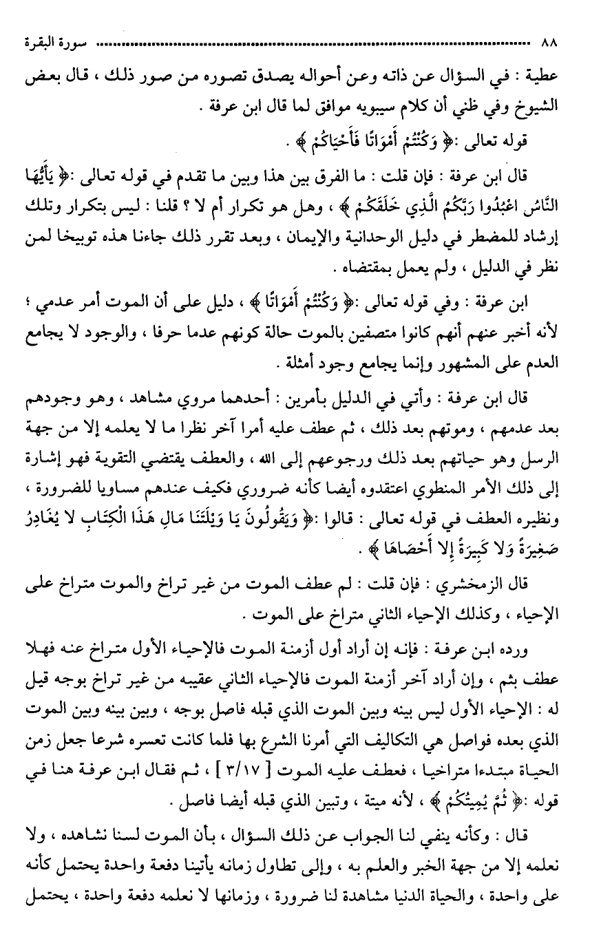 قال ابن عرفة: وأتى في الدليل بأمرين: أحدهما (مروي) مشاهد، وهو وجودهم بعد عدمهم، وموتهم بعد ذلك ثم عطف عليه أمرا آخر نظريا لا يعلم إلا من جهة الرسل وهو حياتهم بعد ذلك، ورجوعهم إلى الله، والعطف يقتضي التسوية فهو إشارة إلى أن ذلك الأمر النظري اعتقدوه حقا كأنه ضروري (فليكن) (عندهم) مساويا للضرورة. ونظيره العطف في قوله تعالى {وَيَقُولُونَ ياويلتنا مَالِ هذا الكتاب لاَ يُغَادِرُ صَغِيرَةً وَلاَ كَبِيرَةً إِلاَّ أَحْصَاهَا} (قالوا: أفاد عطف الكبيرة التسوية في الإحصاء بينها وبين الصغيرة فالمراد أنه لا يدع شيئاً إلا أحصاه).