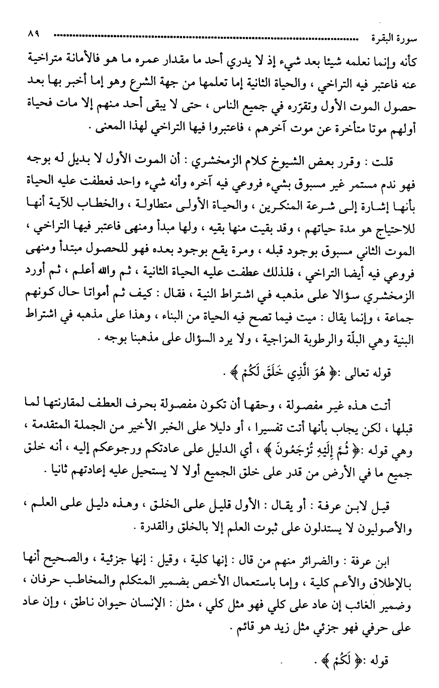 قلت: وقرر بعض الشيوخ كلام الزمخشري بأن الموت الأول لا (بداية) له بوجه فهو عدم مستمر غير مسبوق بشيء فروعي فيه آخره وأنه شيء واحد فعطفت عليه (الحياة) (بالفاء) إشارة إلى سرعة التكوين والحياة الأولى (زمنها) متطاول والخطاب (بالآية) إنما هو (للاحياء) فهو مدة حياتهم، وقد بقيت منها بقية ولها مبدأ ومنتهى، فاعتبر فيها التراخي، والموت الثاني عدم مسبوق بوجود قبله ومرتفع بوجود بعده فهو (محصول له) مبدأ ومنتهى فُروعي أيضا فيه التراخي فلذلك عطفت عليه الحياة الثانية بثم والله أعلم.