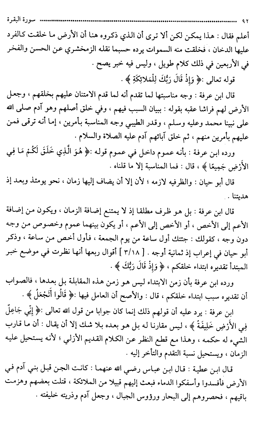قال ابن عرفة: ({وَإِذْ قَالَ رَبُّكَ لِلْمَلاَئِكَةِ} هذه لنا فيها وجه مناسبة لما قبلها) هو أنه لما قدم الامتنان عليهم بخلقهم وجعل الأرض لهم فراشا عقبه ببيان السبب فيهم وفي خلق أهلهم وهو آدم (صَلَّى اللَّهُ عَلَيْهِ وَسَلَّم َ).