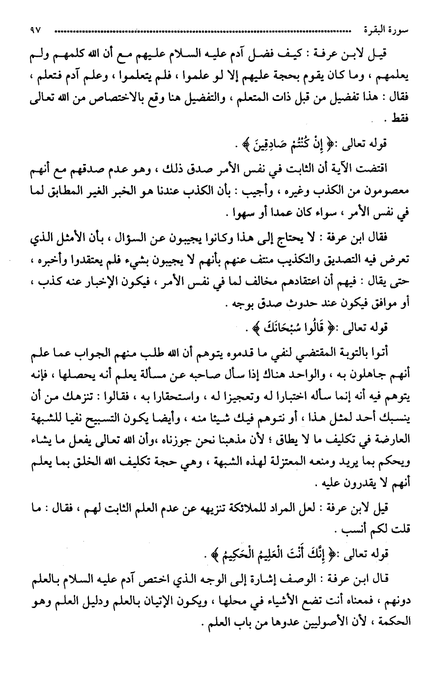 قيل لابن عرفة: كيف فضل آدم عليهم مع أنّ الله علّمه ولم يعلمهم، وما كان تقوم الحجة عليهم إلا لو علّموا فلم يتعلّموا وعلّم آدم فتعلم؟