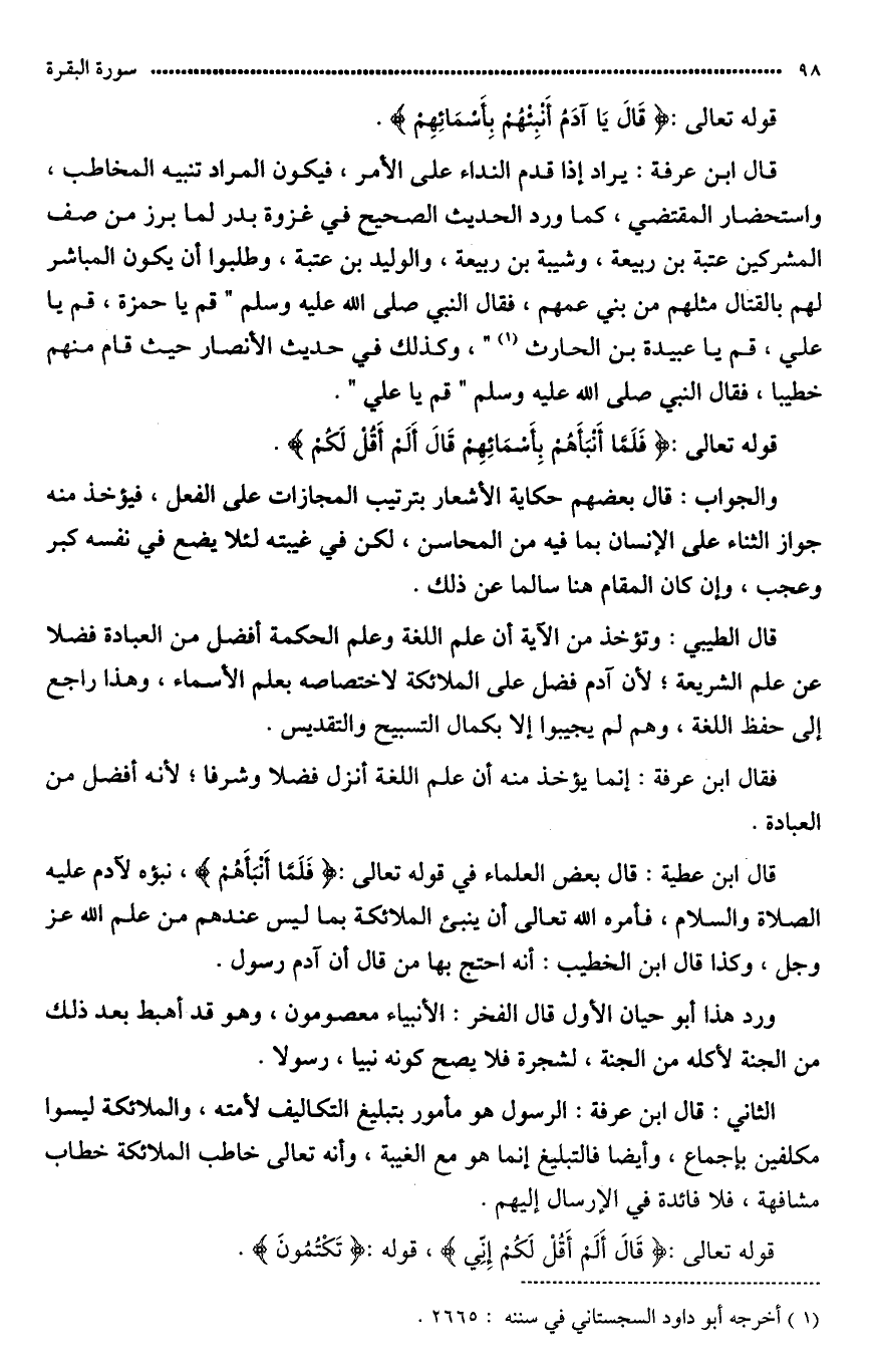 قال ابن عطية: قال بعض العلماء في قوله تعالى: {فَلَمَّآ أَنبَأَهُم بِأَسْمَآئِهِمْ} نبوءة (لآدم) عليه السلام إذ أمره الله أن ينبيء الملائكة بما ليس عندهم من علم الله عَزَّ وَجَلَّ.