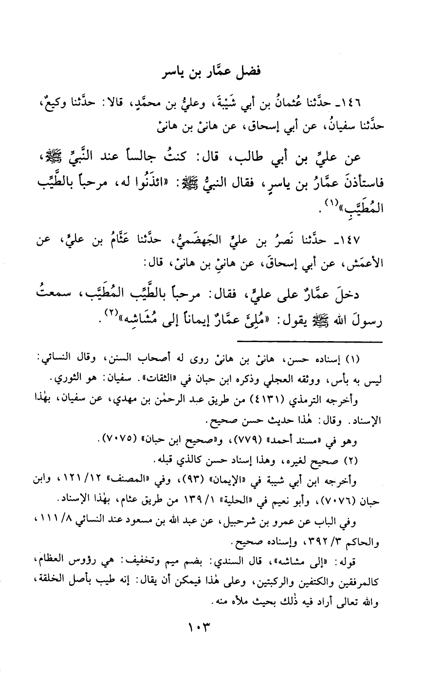 147- حَدَّثَنَا نَصْرُ بْنُ عَلِيٍّ الْجَهْضَمِيُّ ، حَدَّثَنَا عَثَّامُ بْنُ عَلِيٍّ ، عَنِ الأَعْمَشِ ، عَنْ أَبِي إِسْحَاقَ ، عَنْ هَانِئِ بْنِ هَانِئٍ ، قَالَ : دَخَلَ عَمَّارٌ عَلَى عَلِيٍّ ، فَقَالَ : مَرْحَبًا بِالطَّيِّبِ الْمُطَيَّبِ ، سَمِعْتُ رَسُولَ اللهِ صَلَّى الله عَليْهِ وسَلَّمَ يَقُولُ : مُلِئَ عَمَّارٌ إِيمَانًا إِلَى مُشَاشِهِ.