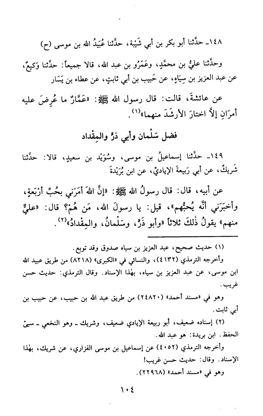 148- حَدَّثَنَا أَبُو بَكْرِ بْنُ أَبِي شَيْبَةَ ، حَدَّثَنَا عُبَيْدُ اللهِ بْنُ مُوسَى (ح) وَحَدَّثَنَا عَلِيُّ بْنُ مُحَمَّدٍ ، وَعَمْرُو بْنُ عَبْدِ اللهِ ، قَالاَ جَمِيعًا : حَدَّثَنَا وَكِيعٌ ، عَنْ عَبْدِ الْعَزِيزِ بْنِ سِيَاهٍ ، عَنْ حَبيبِ بْنِ أَبِي ثَابِتٍ ، عَنْ عَطَاءِ بْنِ يَسَارٍ ، عَنْ عَائِشَةَ قَالَتْ : قَالَ رَسُولُ اللهِ صَلَّى الله عَليْهِ وسَلَّمَ : عَمَّارٌ مَا عُرِضَ عَلَيْهِ أَمْرَانِ إِلاَّ اخْتَارَ الأَرْشَدَ مِنْهُمَا.