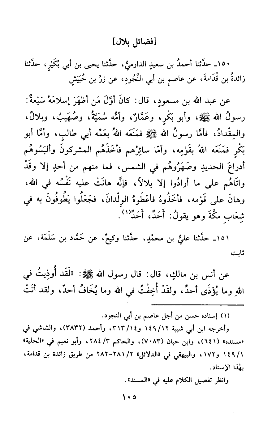 150- حَدَّثَنَا أَحْمَدُ بْنُ سَعِيدٍ الدَّارِمِيُّ ، حَدَّثَنَا يَحْيَى بْنُ أَبِي بُكَيْرٍ ، حَدَّثَنَا زَائِدَةُ بْنُ قُدَامَةَ ، عَنْ عَاصِمِ بْنِ أَبِي النَّجُودِ ، عَنْ زِرِّ بْنِ حُبَيْشٍ , عَنْ عَبْدِ اللهِ بْنِ مَسْعُودٍ ، قَالَ : كَانَ أَوَّلَ مَنْ أَظْهَرَ إِسْلاَمَهُ سَبْعَةٌ : رَسُولُ اللهِ صَلَّى الله عَليْهِ وسَلَّمَ ، وَأَبُو بَكْرٍ ، وَعَمَّارٌ ، وَأُمُّهُ سُمَيَّةُ ، وَصُهَيْبٌ ، وَبِلاَلٌ ، وَالْمِقْدَادُ ، فَأَمَّا رَسُولُ اللهِ صَلَّى الله عَليْهِ وسَلَّمَ فَمَنَعَهُ اللَّهُ بِعَمِّهِ أَبِي طَالِبٍ ، وَأَمَّا أَبُو بَكْرٍ فَمَنَعَهُ اللَّهُ بِقَوْمِهِ ، وَأَمَّا سَائِرُهُمْ فَأَخَذَهُمُ الْمُشْرِكُونَ ، وَأَلْبَسُوهُمْ أَدْرَاعَ الْحَدِيدِ ، وَصَهَرُوهُمْ فِي الشَّمْسِ ، فَمَا مِنْهُمْ مِنْ أَحَدٍ إِلاَّ وَقَدْ وَاتَاهُمْ عَلَى مَا أَرَادُوا ، إِلاَّ بِلاَلاً ، فَإِنَّهُ هَانَتْ عَلَيْهِ نَفْسُهُ فِي اللهِ ، وَهَانَ عَلَى قَوْمِهِ ، فَأَخَذُوهُ فَأَعْطَوْهُ الْوِلْدَانَ ، فَجَعَلُوا يَطُوفُونَ بِهِ فِي شِعَابِ مَكَّةَ ، وَهُوَ يَقُولُ : أَحَدٌ أَحَدٌ.