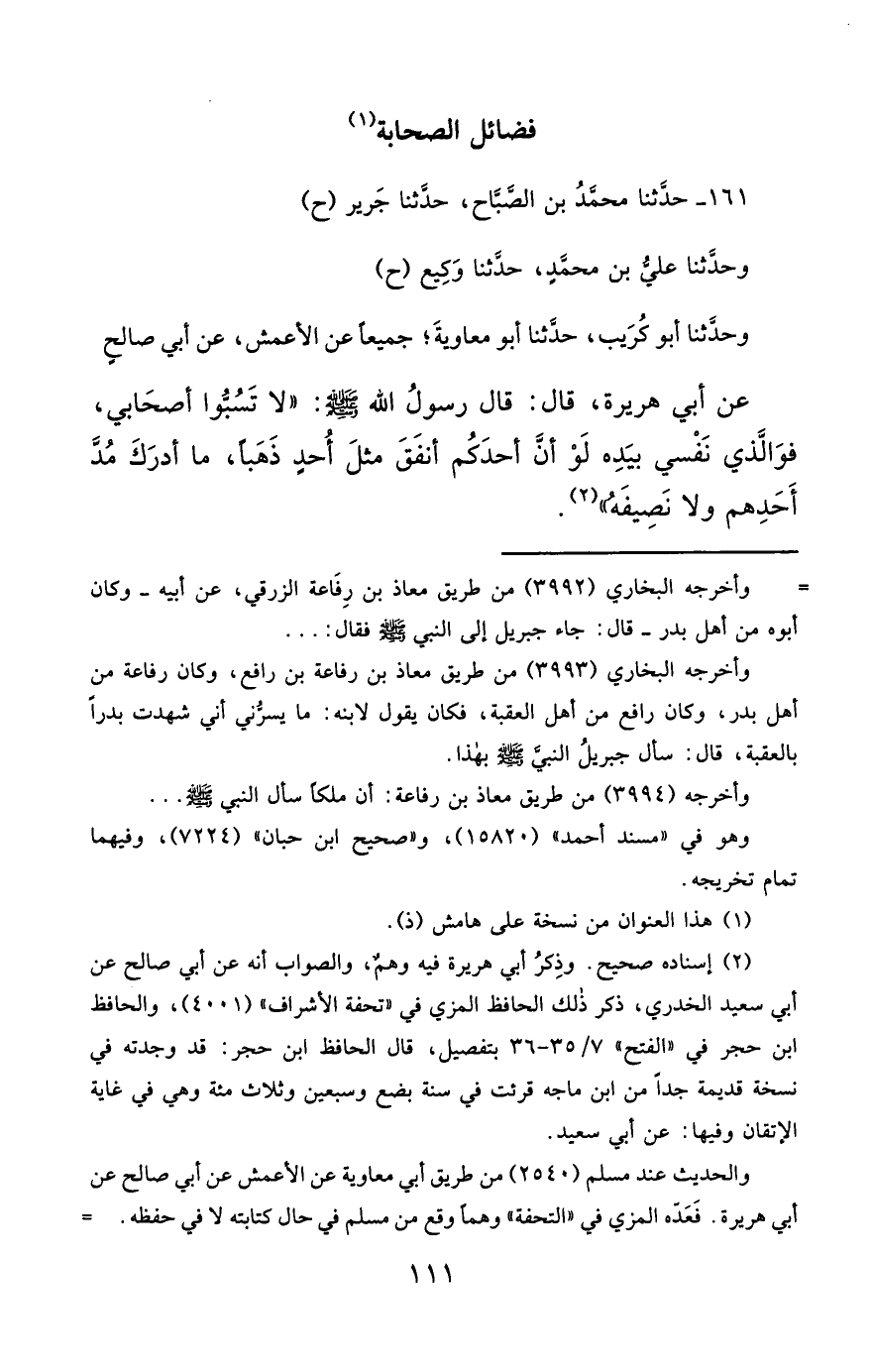 161- حَدَّثَنَا مُحَمَّدُ بْنُ الصَّبَّاحِ ، حَدَّثَنَا جَرِيرٌ (ح) وَحَدَّثَنَا عَلِيُّ بْنُ مُحَمَّدٍ ، حَدَّثَنَا وَكِيعٌ (ح) وَحَدَّثَنَا أَبُو كُرَيْبٍ ، حَدَّثَنَا أَبُو مُعَاوِيَةَ ؛ جَمِيعًا عَنِ الأَعْمَشِ ، عَنْ أَبِي صَالِحٍ ، عَنْ أَبِي هُرَيْرَةَ ، قَالَ : قَالَ رَسُولُ اللهِ صَلَّى الله عَليْهِ وسَلَّمَ : لاَ تَسُبُّوا أَصْحَابِي ، فَوَالَّذِي نَفْسِي بِيَدِهِ ، لَوْ أَنَّ أَحَدَكُمْ أَنْفَقَ مِثْلَ أُحُدٍ ذَهَبًا , مَا أَدْرَكَ مُدَّ أَحَدِهِمْ ، وَلاَ نَصِيفَهُ.