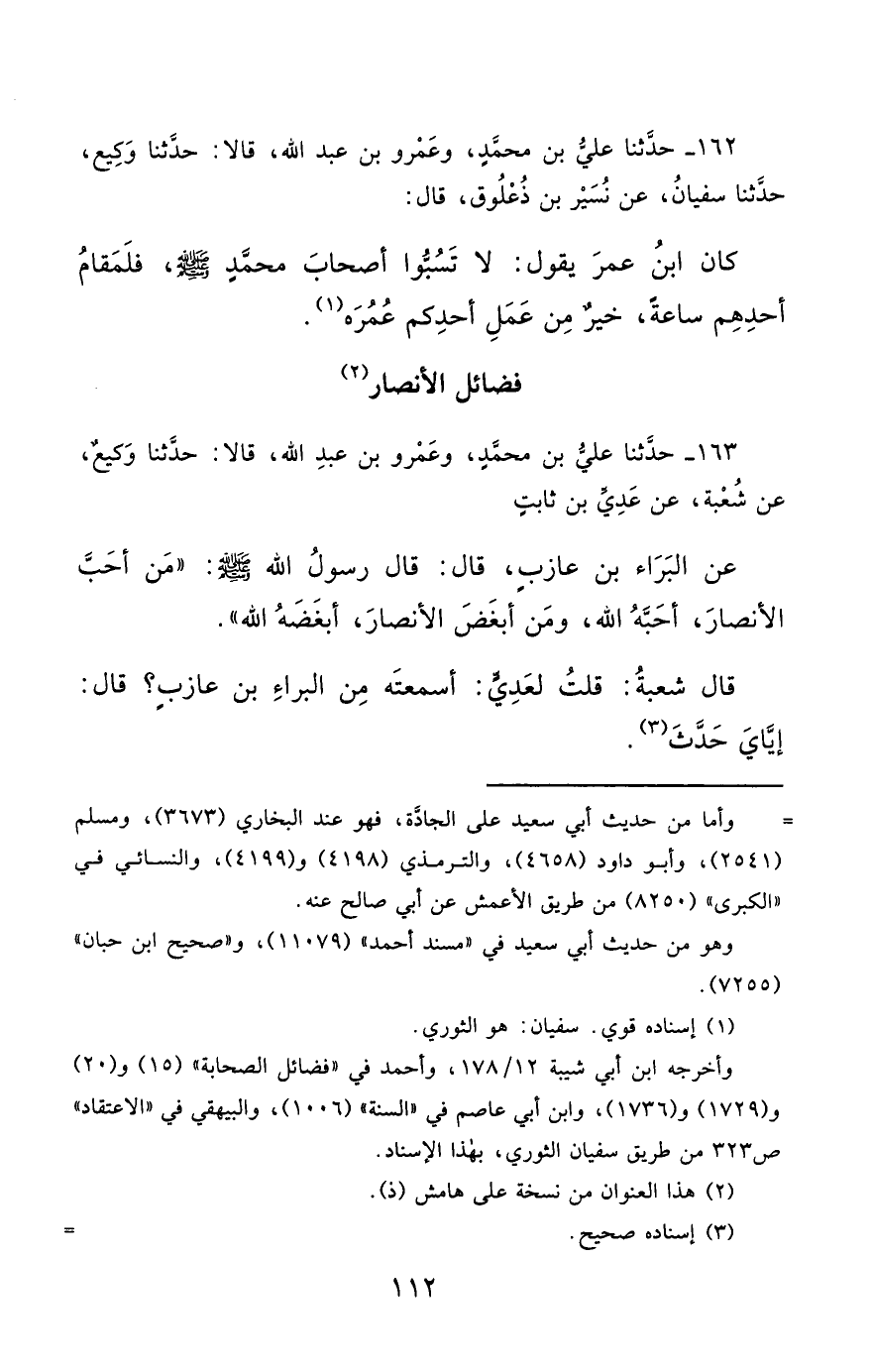 163- حَدَّثَنَا عَلِيُّ بْنُ مُحَمَّدٍ ، وَعَمْرُو بْنُ عَبْدِ اللهِ ، قَالاَ : حَدَّثَنَا وَكِيعٌ ، عَنْ شُعْبَةَ ، عَنْ عَدِيِّ بْنِ ثَابِتٍ ، عَنِ الْبَرَاءِ بْنِ عَازِبٍ ، قَالَ : قَالَ رَسُولُ اللهِ صَلَّى الله عَليْهِ وسَلَّمَ : مَنْ أَحَبَّ الأَنْصَارَ أَحَبَّهُ اللَّهُ ، وَمَنْ أَبْغَضَ الأَنْصَارَ أَبْغَضَهُ اللَّهُ.