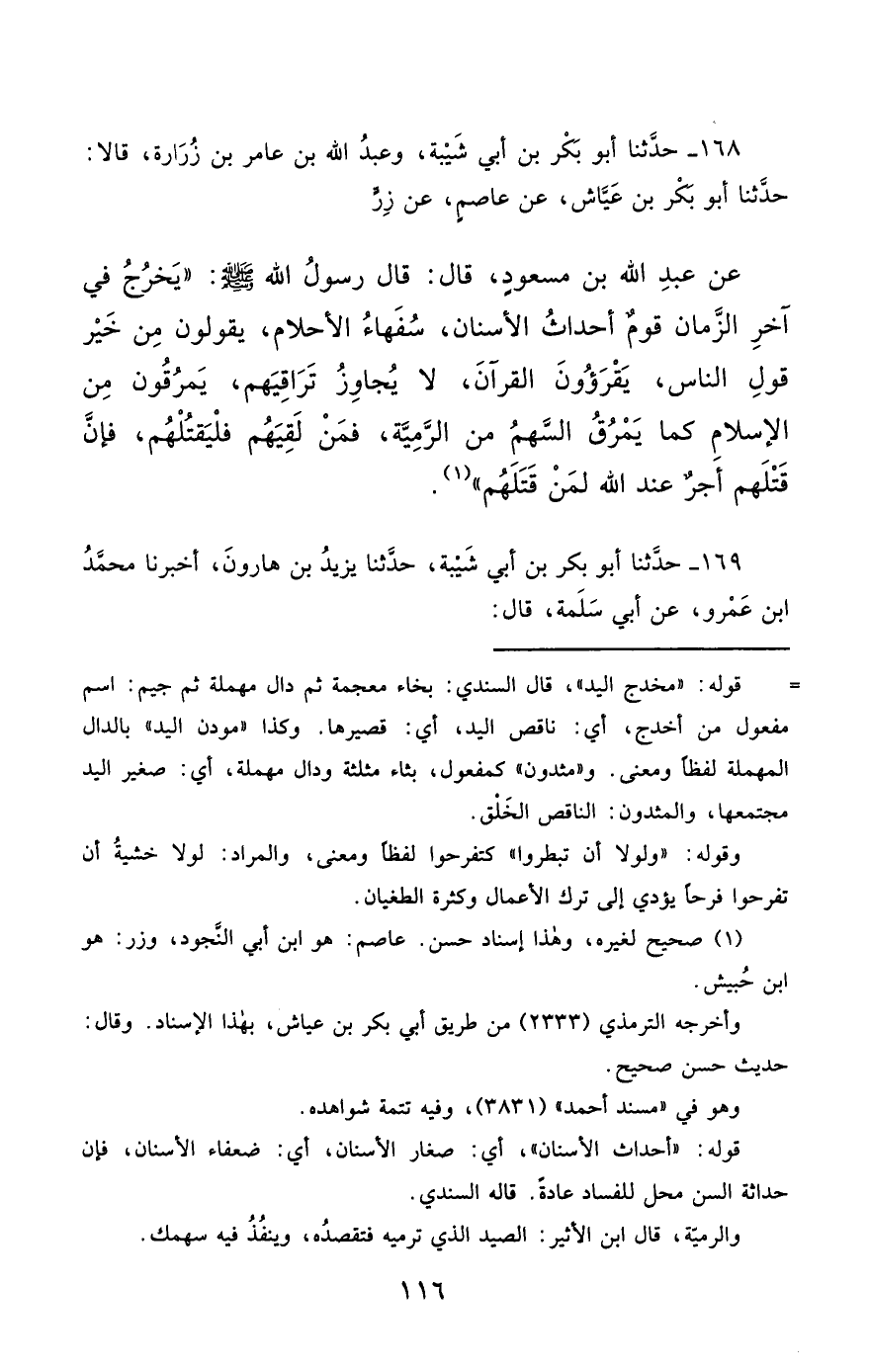 168- حَدَّثَنَا أَبُو بَكْرِ بْنُ أَبِي شَيْبَةَ ، وَعَبْدُ اللهِ بْنُ عَامِرِ بْنِ زُرَارَةَ ، قَالاَ : حَدَّثَنَا أَبُو بَكْرِ بْنُ عَيَّاشٍ ، عَنْ عَاصِمٍ ، عَنْ زِرٍّ ، عَنْ عَبْدِ اللهِ بْنِ مَسْعُودٍ ، قَالَ : قَالَ رَسُولُ اللهِ صَلَّى الله عَليْهِ وسَلَّمَ : يَخْرُجُ فِي آخِرِ الزَّمَانِ قَوْمٌ أَحْدَاثُ الأَسْنَانِ ، سُفَهَاءُ الأَحْلاَمِ ، يَقُولُونَ مِنْ خَيْرِ قَوْلِ النَّاسِ ، يَقْرَؤُونَ الْقُرْآنَ لاَ يُجَاوِزُ تَرَاقِيَهُمْ ، يَمْرُقُونَ مِنَ الإِسْلاَمِ كَمَا يَمْرُقُ السَّهْمُ مِنَ الرَّمِيَّةِ ، فَمَنْ لَقِيَهُمْ فَلْيَقْتُلْهُمْ ، فَإِنَّ قَتْلَهُمْ أَجْرٌ عِنْدَ اللهِ لِمَنْ قَتَلَهُمْ.