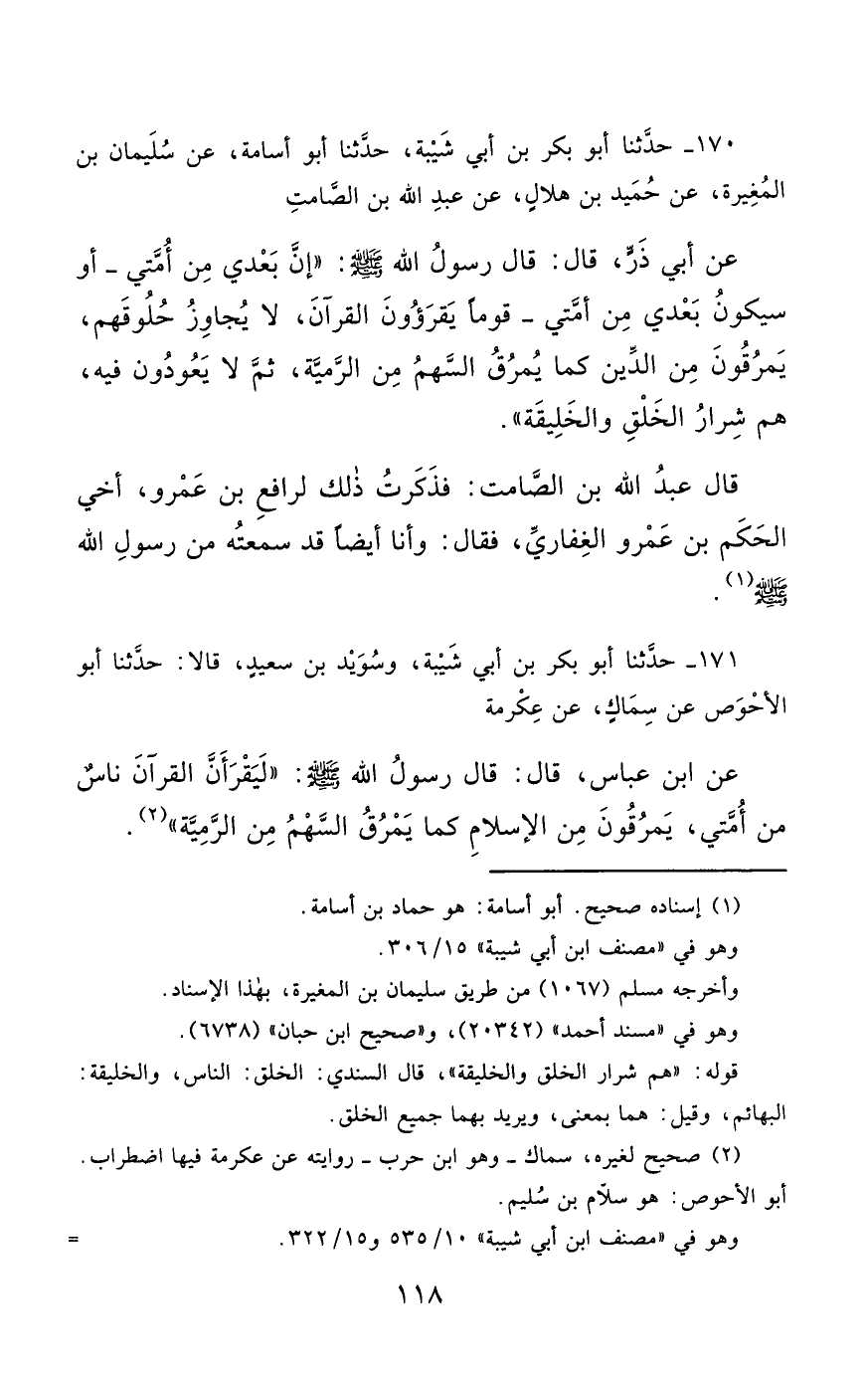 170- حَدَّثَنَا أَبُو بَكْرِ بْنُ أَبِي شَيْبَةَ ، حَدَّثَنَا أَبُو أُسَامَةَ ، عَنْ سُلَيْمَانَ بْنِ الْمُغِيرَةِ ، عَنْ حُمَيْدِ بْنِ هِلاَلٍ ، عَنْ عَبْدِ اللهِ بْنِ الصَّامِتِ ، عَنْ أَبِي ذَرٍّ ، قَالَ : قَالَ رَسُولُ اللهِ صَلَّى الله عَليْهِ وسَلَّمَ : إِنَّ بَعْدِي مِنْ أُمَّتِي ، أَوْ سَيَكُونُ بَعْدِي مِنْ أُمَّتِي قَوْمٌ يَقْرَؤُونَ الْقُرْآنَ لاَ يُجَاوِزُ حُلُوقَهُمْ ، يَمْرُقُونَ مِنَ الدِّينِ كَمَا يَمْرُقُ السَّهْمُ مِنَ الرَّمِيَّةِ ، ثُمَّ لاَ يَعُودُونَ فِيهِ ، هُمْ شِرَارُ الْخَلْقِ وَالْخَلِيقَةِ.