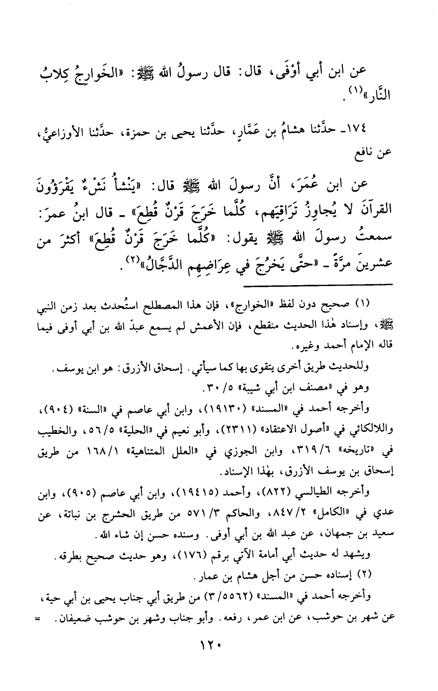 174- حَدَّثَنَا هِشَامُ بْنُ عَمَّارٍ ، حَدَّثَنَا يَحْيَى بْنُ حَمْزَةَ ، حَدَّثَنَا الأَوْزَاعِيُّ ، عَنْ نَافِعٍ ، عَنِ ابْنِ عُمَرَ ، أَنَّ رَسُولَ اللهِ صَلَّى الله عَليْهِ وسَلَّمَ قَالَ : يَنْشَأُ نَشْءٌ يَقْرَؤُونَ الْقُرْآنَ لاَ يُجَاوِزُ تَرَاقِيَهُمْ ، كُلَّمَا خَرَجَ قَرْنٌ قُطِعَ , قَالَ ابْنُ عُمَرَ : سَمِعْتُ رَسُولَ اللهِ صَلَّى الله عَليْهِ وسَلَّمَ يَقُولُ : كُلَّمَا خَرَجَ قَرْنٌ قُطِعَ ، أَكْثَرَ مِنْ عِشْرِينَ مَرَّةً ، حَتَّى يَخْرُجَ فِي عِرَاضِهِمُ الدَّجَّالُ.