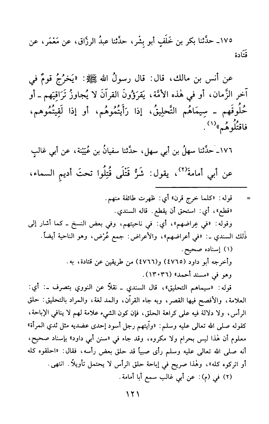 175- حَدَّثَنَا بَكْرُ بْنُ خَلَفٍ أَبُو بِشْرٍ ، حَدَّثَنَا عَبْدُ الرَّزَّاقِ ، عَنْ مَعْمَرٍ ، عَنْ قَتَادَةَ ، عَنْ أَنَسِ بْنِ مَالِكٍ ، قَالَ : قَالَ رَسُولُ اللهِ صَلَّى الله عَليْهِ وسَلَّمَ : يَخْرُجُ قَوْمٌ فِي آخِرِ الزَّمَانِ ، أَوْ فِي هَذِهِ الأُمَّةِ ، يَقْرَؤُونَ الْقُرْآنَ لاَ يُجَاوِزُ تَرَاقِيَهُمْ ، أَوْ حُلُوقَهُمْ ، سِيمَاهُمُ التَّحْلِيقُ ، إِذَا رَأَيْتُمُوهُمْ ، أَوْ إِذَا لَقِيتُمُوهُمْ فَاقْتُلُوهُمْ.
