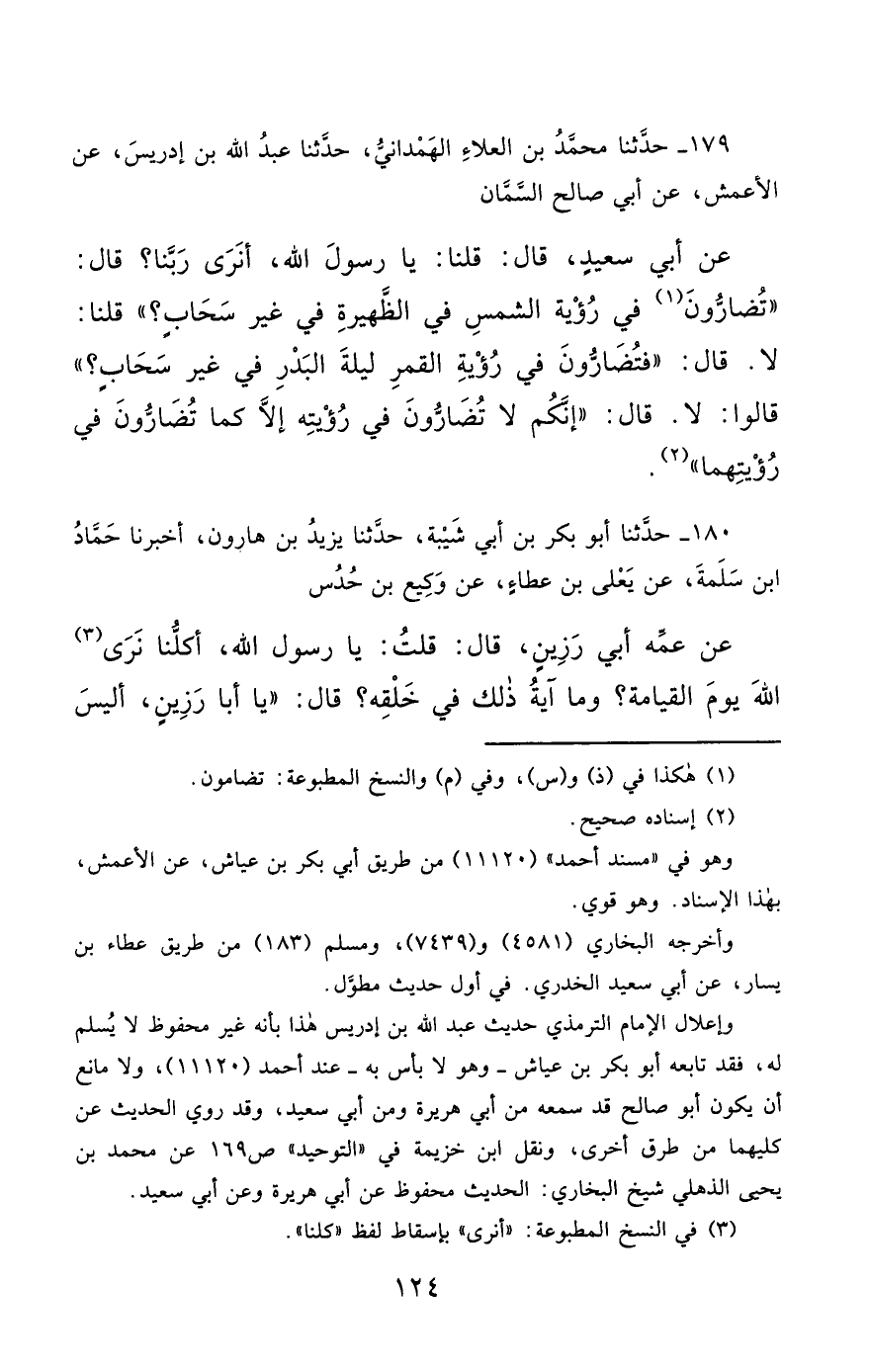 179- حَدَّثَنَا مُحَمَّدُ بْنُ الْعَلاَءِ الْهَمْدَانِيُّ ، حَدَّثَنَا عَبْدُ اللهِ بْنُ إِدْرِيسَ ، عَنِ الأَعْمَشِ ، عَنْ أَبِي صَالِحٍ السَّمَّانِ ، عَنْ أَبِي سَعِيدٍ ، قَالَ : قُلْنَا : يَا رَسُولَ اللهِ ، أَنَرَى رَبَّنَا ؟ قَالَ : تُضَارُّونَ فِي رُؤْيَةِ الشَّمْسِ فِي الظَّهِيرَةِ فِي غَيْرِ سَحَابٍ ؟ قُلْنَا : لاَ ، قَالَ : فَتَضَارُّونَ فِي رُؤْيَةِ الْقَمَرِ لَيْلَةَ الْبَدْرِ فِي غَيْرِ سَحَابٍ ؟ قَالُوا : لاَ ، قَالَ : إِنَّكُمْ لاَ تَضَارُّونَ فِي رُؤْيَتِهِ ، إِلاَّ كَمَا تَضَارُّونَ فِي رُؤْيَتِهِمَا.