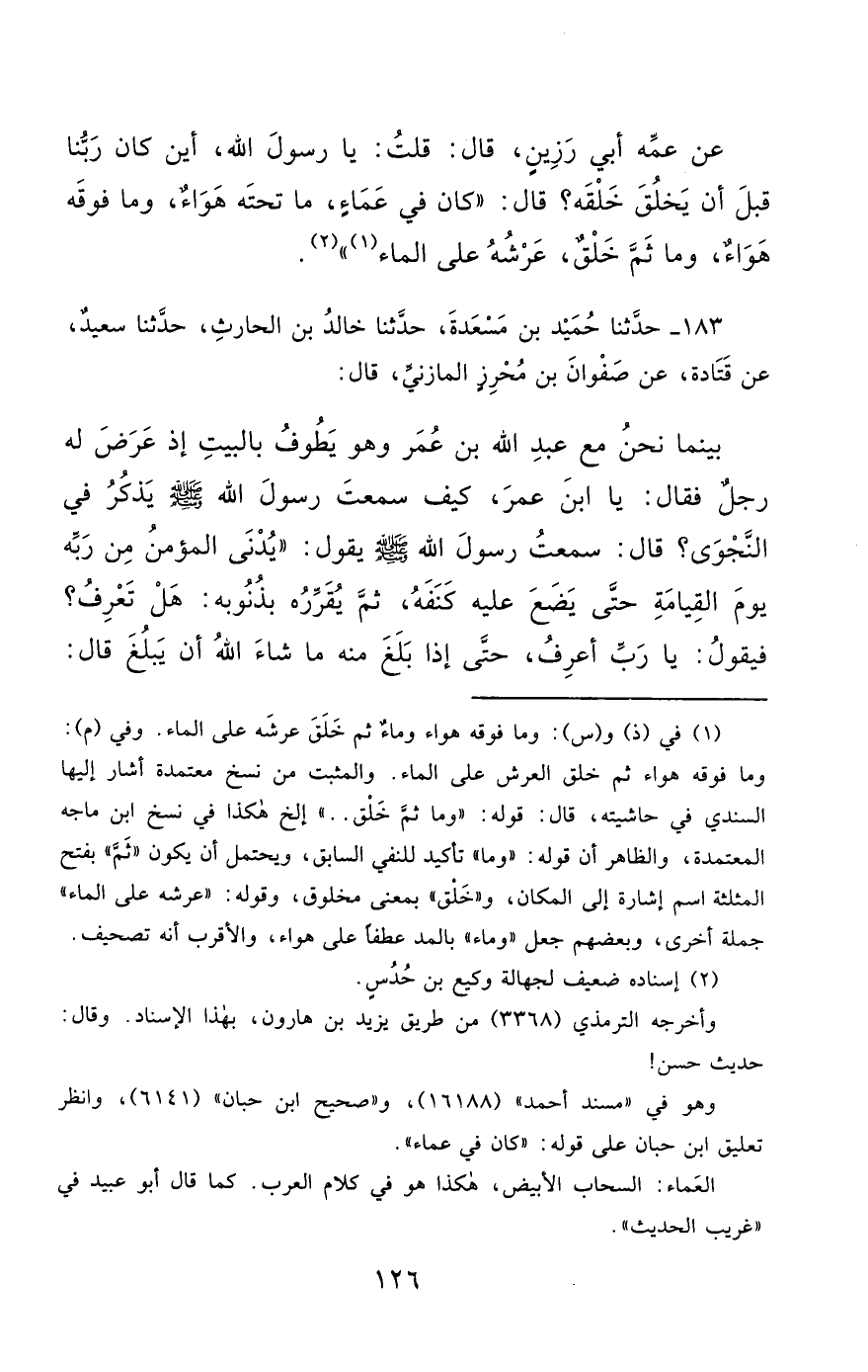 183- حَدَّثَنَا حُمَيْدُ بْنُ مَسْعَدَةَ ، حَدَّثَنَا خَالِدُ بْنُ الْحَارِثِ ، حَدَّثَنَا سَعِيدٌ ، عَنْ قَتَادَةَ ، عَنْ صَفْوَانَ بْنِ مُحْرِزٍ الْمَازِنِيِّ ، قَالَ : بَيْنَمَا نَحْنُ مَعَ عَبْدِ اللهِ بْنِ عُمَرَ وَهُوَ يَطُوفُ بِالْبَيْتِ ، إِذْ عَرَضَ لَهُ رَجُلٌ ، فَقَالَ : يَا ابْنَ عُمَرَ ، كَيْفَ سَمِعْتَ رَسُولَ اللهِ صَلَّى الله عَليْهِ وسَلَّمَ يَذْكُرُ فِي النَّجْوَى ؟ قَالَ : سَمِعْتُ رَسُولَ اللهِ صَلَّى الله عَليْهِ وسَلَّمَ يَقُولُ : يُدْنَى الْمُؤْمِنُ مِنْ رَبِّهِ يَوْمَ الْقِيَامَةِ ، حَتَّى يَضَعَ عَلَيْهِ كَنَفَهُ ، ثُمَّ يُقَرِّرُهُ بِذُنُوبِهِ : هَلْ تَعْرِفُ ؟ فَيَقُولُ : يَا رَبِّ ، أَعْرِفُ ، حَتَّى إِذَا بَلَغَ مِنْهُ مَا شَاءَ اللَّهُ أَنْ يَبْلُغَ ، قَالَ : إِنِّي سَتَرْتُهَا عَلَيْكَ فِي الدُّنْيَا ، وَأَنَا أَغْفِرُهَا لَكَ الْيَوْمَ ، قَالَ : ثُمَّ يُعْطَى صَحِيفَةَ حَسَنَاتِهِ وَكِتَابَهُ بِيَمِينِهِ ، قَالَ : وَأَمَّا الْكَافِرُ أَوِ الْمُنَافِقُ ، فَيُنَادَى عَلَى رُؤُوسِ الأَشْهَادِ.