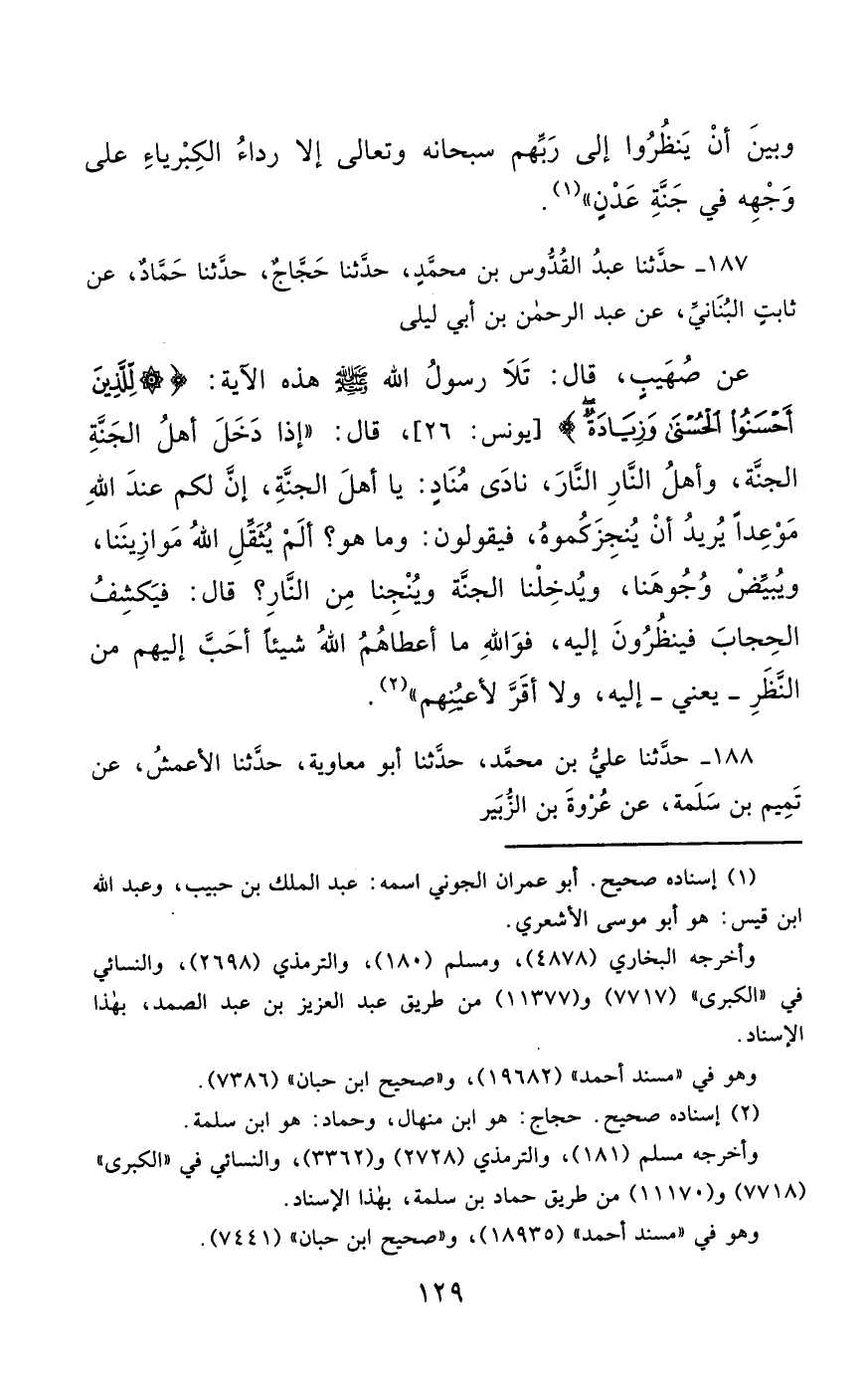 187- حَدَّثَنَا عَبْدُ الْقُدُّوسِ بْنُ مُحَمَّدٍ ، حَدَّثَنَا حَجَّاجٌ ، حَدَّثَنَا حَمَّادٌ ، عَنْ ثَابِتٍ الْبُنَانِيِّ ، عَنْ عَبْدِ الرَّحْمَنِ بْنِ أَبِي لَيْلَى ، عَنْ صُهَيْبٍ ، قَالَ : تَلاَ رَسُولُ اللهِ صَلَّى الله عَليْهِ وسَلَّمَ هَذِهِ الآيَةَ : {لِلَّذِينَ أَحْسَنُوا الْحُسْنَى وَزِيَادَةٌ} قَالَ : إِذَا دَخَلَ أَهْلُ الْجَنَّةِ الْجَنَّةَ ، وَأَهْلُ النَّارِ النَّارَ ، نَادَى مُنَادٍ : يَا أَهْلَ الْجَنَّةِ , إِنَّ لَكُمْ عِنْدَ اللهِ مَوْعِدًا يُرِيدُ أَنْ يُنْجِزَكُمُوهُ ، فَيَقُولُونَ : وَمَا هُوَ ؟ أَلَمْ يُثَقِّلِ اللَّهُ مَوَازِينَنَا ، وَيُبَيِّضْ وُجُوهَنَا ، وَيُدْخِلْنَا الْجَنَّةَ ، وَيُنْجِنَا مِنَ النَّارِ ؟ قَالَ : فَيَكْشِفُ الْحِجَابَ ، فَيَنْظُرُونَ إِلَيْهِ ، فَوَاللَّهِ مَا أَعَطَاهُمُ اللَّهُ شَيْئًا أَحَبَّ إِلَيْهِمْ مِنَ النَّظَرِ ، يَعْنِي إِلَيْهِ ، وَلاَ أَقَرَّ لأَعْيُنِهِمْ.