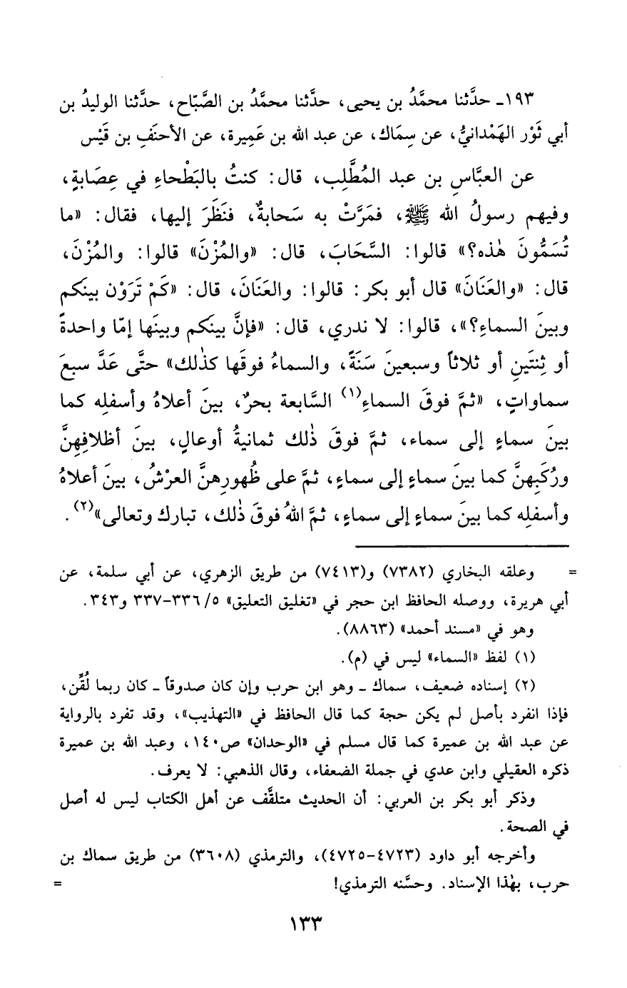193- حَدَّثَنَا مُحَمَّدُ بْنُ يَحْيَى ، حَدَّثَنَا مُحَمَّدُ بْنُ الصَّبَّاحِ ، حَدَّثَنَا الْوَلِيدُ بْنُ أَبِي ثَوْرٍ الْهَمْدَانِيُّ ، عَنْ سِمَاكٍ ، عَنْ عَبْدِ اللهِ بْنِ عَمِيرَةَ ، عَنِ الأَحْنَفِ بْنِ قَيْسٍ ، عَنِ الْعَبَّاسِ بْنِ عَبْدِ الْمُطَّلِبِ ، قَالَ : كُنْتُ بِالْبَطْحَاءِ فِي عِصَابَةٍ ، وَفِيهِمْ رَسُولُ اللهِ صَلَّى الله عَليْهِ وسَلَّمَ ، فَمَرَّتْ بِهِ سَحَابَةٌ , فَنَظَرَ إِلَيْهَا ، فَقَالَ : مَا تُسَمُّونَ هَذِهِ ؟ قَالُوا : السَّحَابَ ، قَالَ : وَالْمُزْنَ , قَالُوا : وَالْمُزْنَ ، قَالَ : وَالْعَنَانَ , قَالَ أَبُو بَكْرٍ : قَالُوا : وَالْعَنَانَ ، قَالَ : كَمْ تَرَوْنَ بَيْنَكُمْ وَبَيْنَ السَّمَاءِ ؟ قَالُوا : لاَ نَدْرِي ، قَالَ : فَإِنَّ بَيْنَكُمْ وَبَيْنَهَا إِمَّا وَاحِدَةً ، أَوِ ثِنْتَيْنِ ، أَوْ ثَلاَثًا وَسَبْعِينَ سَنَةً ، وَالسَّمَاءُ فَوْقَهَا كَذَلِكَ ، حَتَّى عَدَّ سَبْعَ سَمَاوَاتٍ ، ثُمَّ فَوْقَ السَّمَاءِ السَّابِعَةِ بَحْرٌ ، بَيْنَ أَعْلاَهُ وَأَسْفَلِهِ كَمَا بَيْنَ سَمَاءٍ إِلَى سَمَاءٍ ، ثُمَّ فَوْقَ ذَلِكَ ثَمَانِيَةُ أَوْعَالٍ ، بَيْنَ أَظْلاَفِهِنَّ وَرُكَبِهِنَّ كَمَا بَيْنَ سَمَاءٍ إِلَى سَمَاءٍ ، ثُمَّ عَلَى ظُهُورِهِنَّ الْعَرْشُ ، بَيْنَ أَعْلاَهُ وَأَسْفَلِهِ كَمَا بَيْنَ سَمَاءٍ إِلَى سَمَاءٍ ، ثُمَّ اللَّهُ فَوْقَ ذَلِكَ ، تَبَارَكَ وَتَعَالَى.