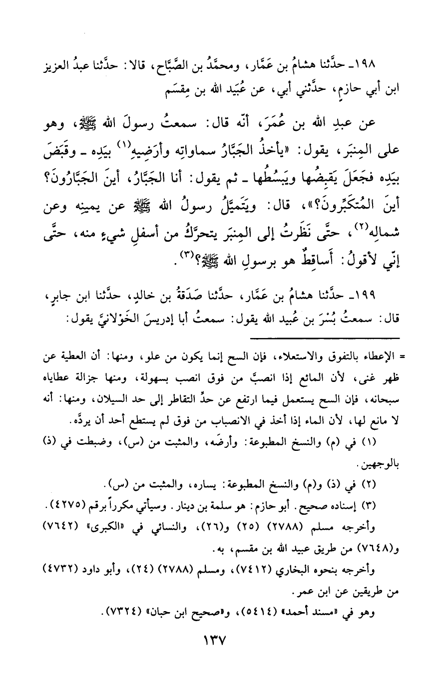 198- حَدَّثَنَا هِشَامُ بْنُ عَمَّارٍ ، وَمُحَمَّدُ بْنُ الصَّبَّاحِ ، قَالاَ : حَدَّثَنَا عَبْدُ الْعَزِيزِ بْنُ أَبِي حَازِمٍ , حَدَّثَنِي أَبِي ، عَنْ عُبَيْدِ اللهِ بْنِ مِقْسَمٍ ، عَنْ عَبْدِ اللهِ بْنِ عُمَرَ ، أَنَّهُ قَالَ : سَمِعْتُ رَسُولَ اللهِ صَلَّى الله عَليْهِ وسَلَّمَ وَهُوَ عَلَى الْمِنْبَرِ يَقُولُ : يَأْخُذُ الْجَبَّارُ سَمَاوَاتِهِ وَأَرَضِيهِ بِيَدِهِ ، وَقَبَضَ بِيَدِهِ , فَجَعَلَ يَقْبِضُهَا وَيَبْسُطُهَا ، ثُمَّ يَقُولُ : أَنَا الْجَبَّارُ ، أَيْنَ الْجَبَّارُونَ ؟ أَيْنَ الْمُتَكَبِّرُونَ ؟ قَالَ : وَيَتَمَيَّلُ رَسُولُ اللهِ صَلَّى الله عَليْهِ وسَلَّمَ عَنْ يَمِينِهِ وَعَنْ شِمَالِهِ ، حَتَّى نَظَرْتُ إِلَى الْمِنْبَرِ يَتَحَرَّكُ مِنْ أَسْفَلِ شَيْءٍ مِنْهُ ، حَتَّى إِنِّي لأَقُولُ : أَسَاقِطٌ هُوَ بِرَسُولِ اللهِ صَلَّى الله عَليْهِ وسَلَّمَ ؟.