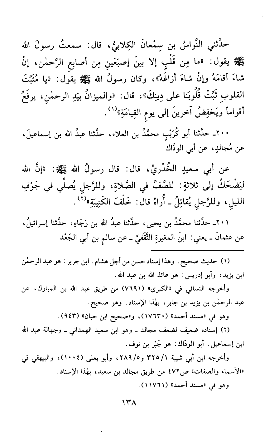 200- حَدَّثَنَا أَبُو كُرَيْبٍ مُحَمَّدُ بْنُ الْعَلاَءِ ، حَدَّثَنَا عَبْدُ اللهِ بْنُ إِسْمَاعِيلَ ، عَنْ مُجَالِدٍ ، عَنْ أَبِي الْوَدَّاكِ ، عَنْ أَبِي سَعِيدٍ الْخُدْرِيِّ ، قَالَ : قَالَ رَسُولُ اللهِ صَلَّى الله عَليْهِ وسَلَّمَ : إِنَّ اللَّهَ لَيَضْحَكُ إِلَى ثَلاَثَةٍ : لِلصَّفِّ فِي الصَّلاَةِ ، وَلِلرَّجُلِ يُصَلِّي فِي جَوْفِ اللَّيْلِ ، وَلِلرَّجُلِ يُقَاتِلُ ، أُرَاهُ قَالَ : خَلْفَ الْكَتِيبَةِ.