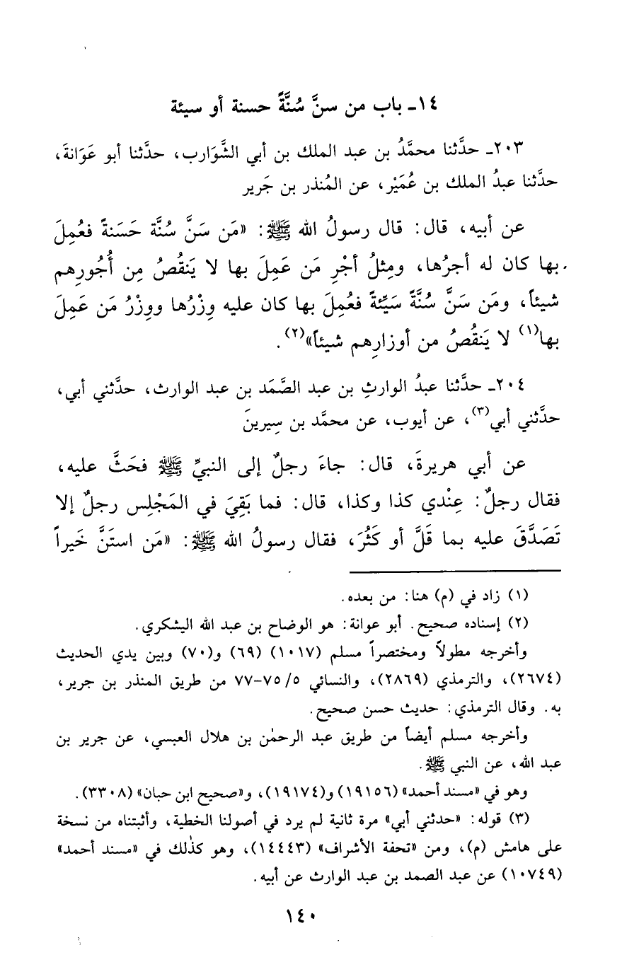 204- حَدَّثَنَا عَبْدُ الْوَارِثِ بْنُ عَبْدِ الصَّمَدِ بْنِ عَبْدِ الْوَارِثِ ، حَدَّثَنِي أَبِي , حَدَّثَنِي أَبِي ، عَنْ أَيُّوبَ ، عَنْ مُحَمَّدِ بْنِ سِيرِينَ ، عَنْ أَبِي هُرَيْرَةَ ، قَالَ : جَاءَ رَجُلٌ إِلَى النَّبِيِّ صَلَّى الله عَليْهِ وسَلَّمَ فَحَثَّ عَلَيْهِ ، فَقَالَ رَجُلٌ : عِنْدِي كَذَا وَكَذَا ، قَالَ ، فَمَا بَقِيَ فِي الْمَجْلِسِ رَجُلٌ إِلاَّ تَصَدَّقَ عَلَيْهِ بِمَا قَلَّ أَوْ كَثُرَ ، فَقَالَ رَسُولُ اللهِ صَلَّى الله عَليْهِ وسَلَّمَ : مَنِ اسْتَنَّ خَيْرًا فَاسْتُنَّ بِهِ ، كَانَ لَهُ أَجْرُهُ كَامِلاً ، وَمِنْ أُجُورِ مَنِ اسْتَنَّ بِهِ ، وَلاَ يَنْقُصُ مِنْ أُجُورِهِمْ شَيْئًا ، وَمَنِ اسْتَنَّ سُنَّةً سَيِّئَةً فَاسْتُنَّ بِهِ ، فَعَلَيْهِ وِزْرُهُ كَامِلاً ، وَمِنْ أَوْزَارِ الَّذِي اسْتَنَّ بِهِ ، وَلاَ يَنْقُصُ مِنْ أَوْزَارِهِمْ شَيْئًا.