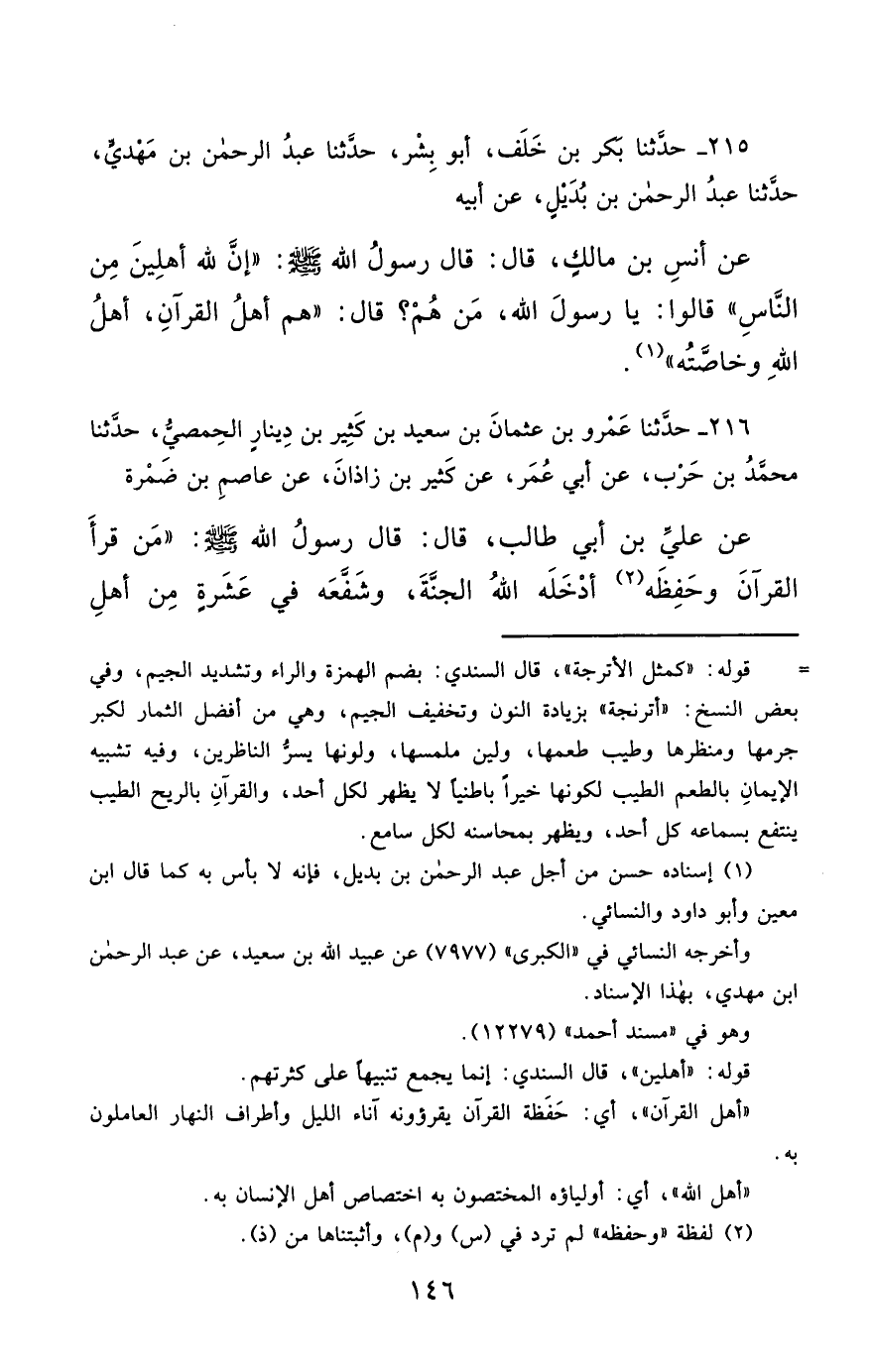 215- حَدَّثَنَا بَكْرُ بْنُ خَلَفٍ أَبُو بِشْرٍ ، حَدَّثَنَا عَبْدُ الرَّحْمَنِ بْنُ مَهْدِيٍّ ، حَدَّثَنَا عَبْدُ الرَّحْمَنِ بْنُ بُدَيْلٍ ، عَنْ أَبِيهِ ، عَنْ أَنَسِ بْنِ مَالِكٍ ، قَالَ : قَالَ رَسُولُ اللهِ صَلَّى الله عَليْهِ وسَلَّمَ : إِنَّ لِلَّهِ أَهْلِينَ مِنَ النَّاسِ , قَالُوا : يَا رَسُولَ اللهِ ، مَنْ هُمْ ؟ قَالَ : هُمْ أَهْلُ الْقُرْآنِ ، أَهْلُ اللهِ وَخَاصَّتُهُ.
