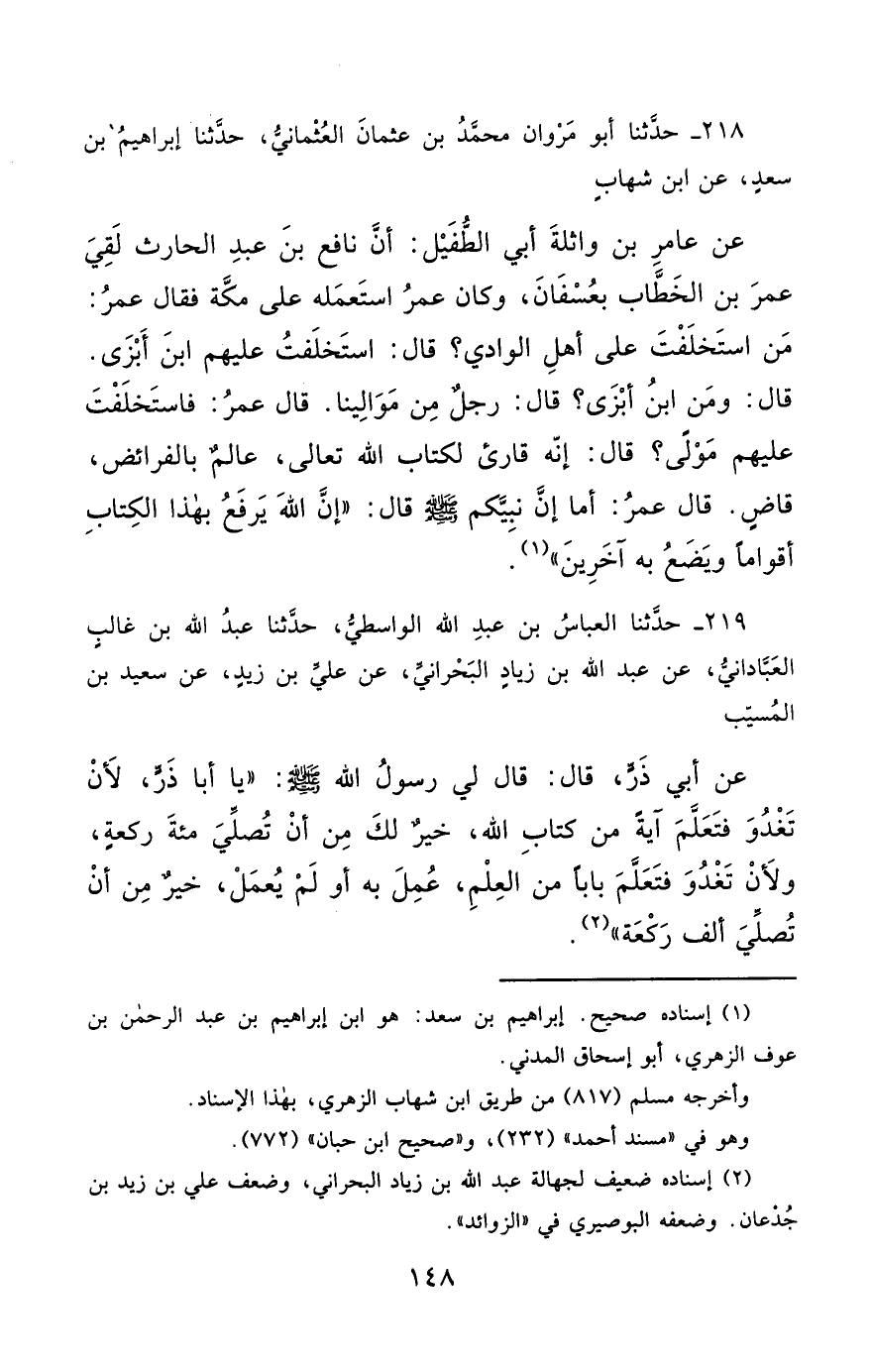 218- حَدَّثَنَا أَبُو مَرْوَانَ مُحَمَّدُ بْنُ عُثْمَانَ الْعُثْمَانِيُّ ، حَدَّثَنَا إِبْرَاهِيمُ بْنُ سَعْدٍ ، عَنِ ابْنِ شِهَابٍ ، عَنْ عَامِرِ بْنِ وَاثِلَةَ أَبِي الطُّفَيْلِ ، أَنَّ نَافِعَ بْنَ عَبْدِ الْحَارِثِ ، لَقِيَ عُمَرَ بْنَ الْخَطَّابِ بِعُسْفَانَ ، وَكَانَ عُمَرُ اسْتَعْمَلَهُ عَلَى مَكَّةَ ، فَقَالَ عُمَرُ : مَنِ اسْتَخْلَفْتَ عَلَى أَهْلِ الْوَادِي ؟ قَالَ : اسْتَخْلَفْتُ عَلَيْهِمُ ابْنَ أَبْزَى ، قَالَ : وَمَنِ ابْنُ أَبْزَى ؟ قَالَ : رَجُلٌ مِنْ مَوَالِينَا ، قَالَ عُمَرُ : فَاسْتَخْلَفْتَ عَلَيْهِمْ مَوْلًى ؟ قَالَ : إِنَّهُ قَارِئٌ لِكِتَابِ اللهِ تَعَالَى ، عَالِمٌ بِالْفَرَائِضِ ، قَاضٍ ، قَالَ عُمَرُ : أَمَا إِنَّ نَبِيَّكُمْ صَلَّى الله عَليْهِ وسَلَّمَ قَالَ : إِنَّ اللَّهَ يَرْفَعُ بِهَذَا الْكِتَابِ أَقْوَامًا ، وَيَضَعُ بِهِ آخَرِينَ.