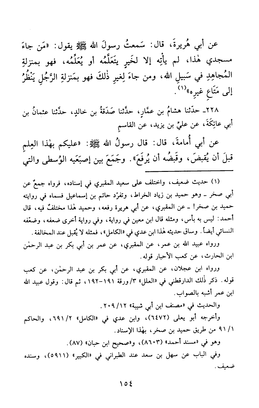 228- حَدَّثَنَا هِشَامُ بْنُ عَمَّارٍ ، حَدَّثَنَا صَدَقَةُ بْنُ خَالِدٍ ، حَدَّثَنَا عُثْمَانُ بْنُ أَبِي عَاتِكَةَ ، عَنْ عَلِيِّ بْنِ يَزِيدَ ، عَنِ الْقَاسِمِ ، عَنْ أَبِي أُمَامَةَ ، قَالَ : قَالَ رَسُولُ اللهِ صَلَّى الله عَليْهِ وسَلَّمَ : عَلَيْكُمْ بِهَذَا الْعِلْمِ قَبْلَ أَنْ يُقْبَضَ ، وَقَبْضُهُ أَنْ يُرْفَعَ , وَجَمَعَ بَيْنَ إِصْبَعَيْهِ الْوُسْطَى وَالَّتِي تَلِي الإِبْهَامَ هَكَذَا , ثُمَّ قَالَ : الْعَالِمُ وَالْمُتَعَلِّمُ شَرِيكَانِ فِي الأَجْرِ ، وَلاَ خَيْرَ فِي سَائِرِ النَّاسِ بَعْدُ.